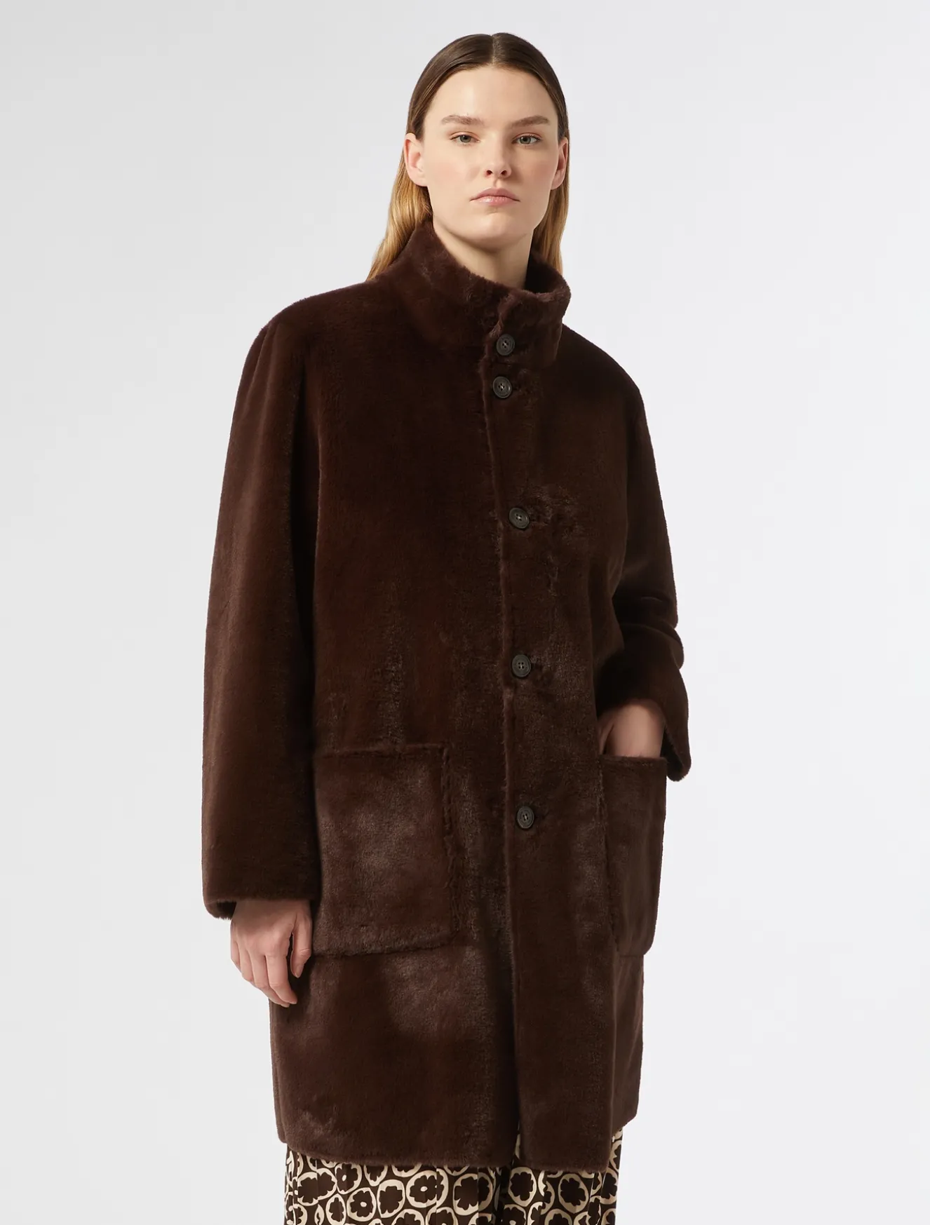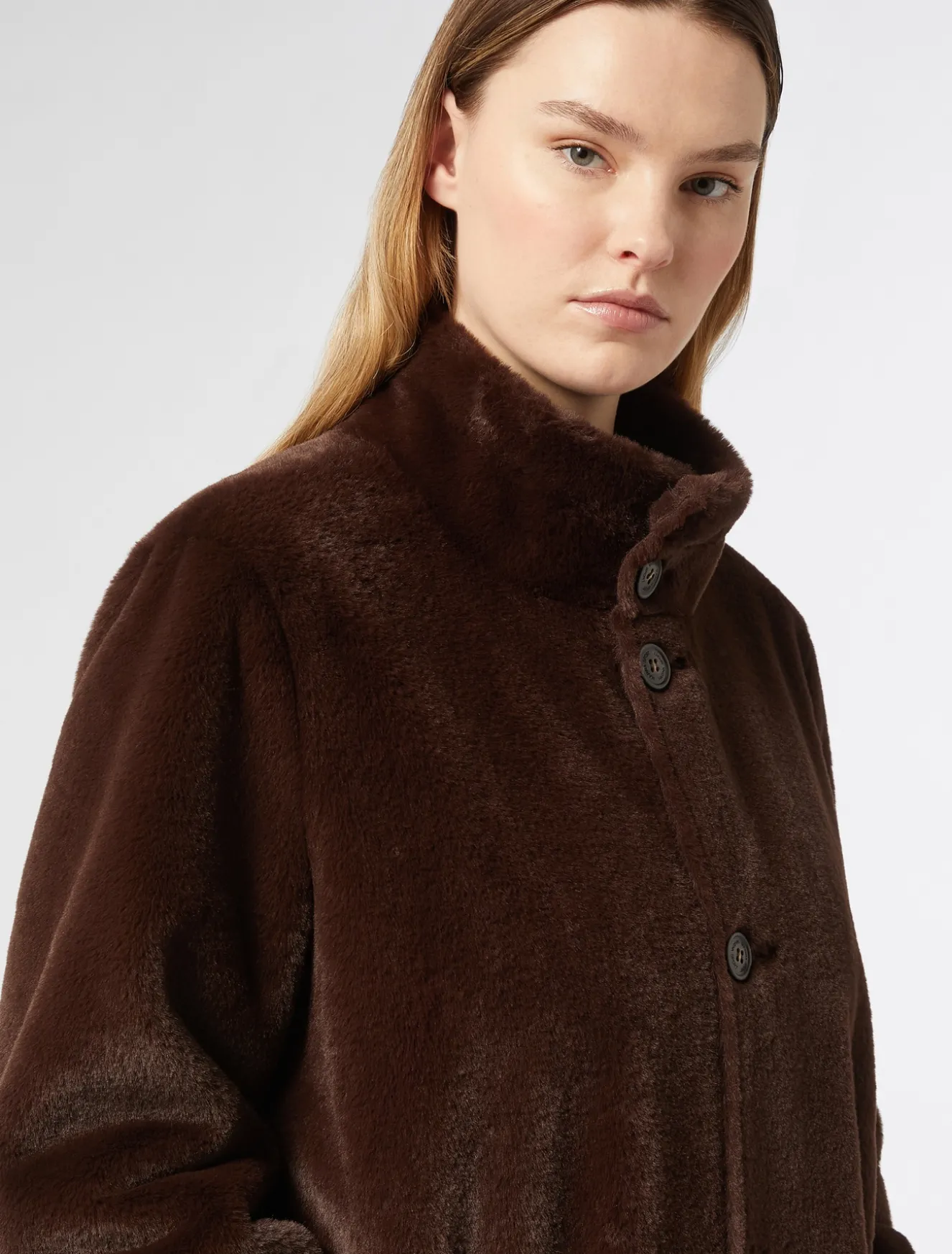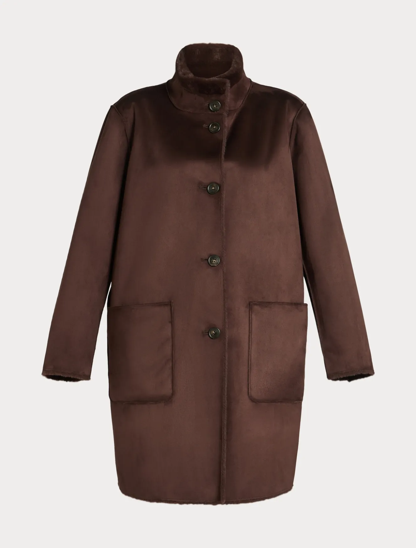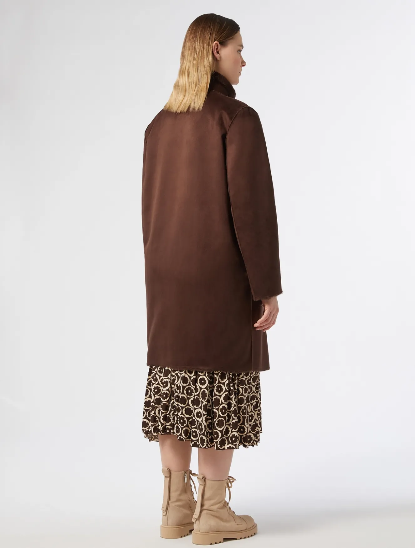 Zwei Modell in einem mit diesem wendbaren Maxi-Mantel, der auf der einen Seite aus weichem strukturiertem Gewebe und auf der anderen aus Gewebe in Wildlederstruktur gefertigt ist. Perfekt für die Saison, geeignet für zahlreiche Anlässe.Das Kleidungsstück ist Teil der Kollektion Marina Sport.