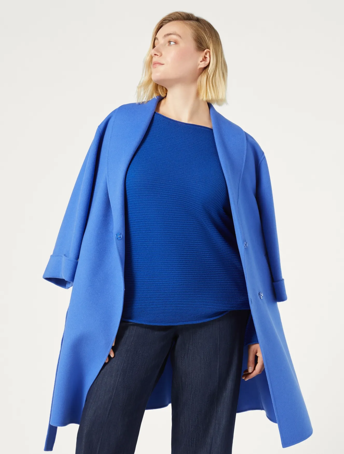 Pullover aus pflegeleichtem Garn aus reiner Wolle in nahtlosem Linksstrick. Jetzt neu mit Rüschenbündchen.Das Kleidungsstück ist Teil der Kollektion „Voyage“.