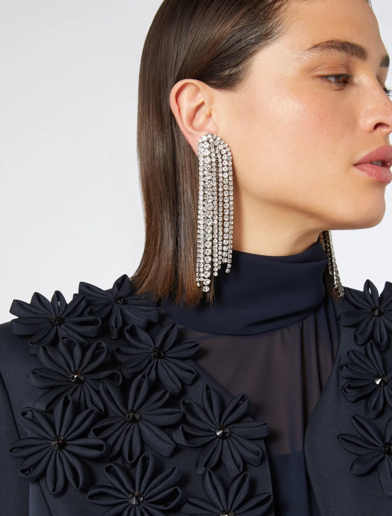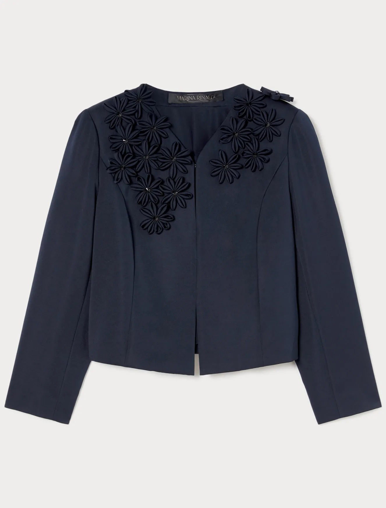 Diese etwas schmaler geschnittene Duchesse-Jacke ist an der Schulterpasse mit von Hand applizierten Stoffblumen und Jais verziert. Raffiniert und ideal für besondere Anlässe.