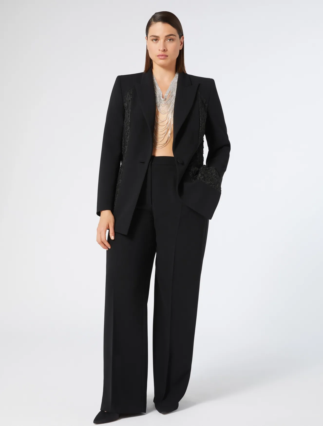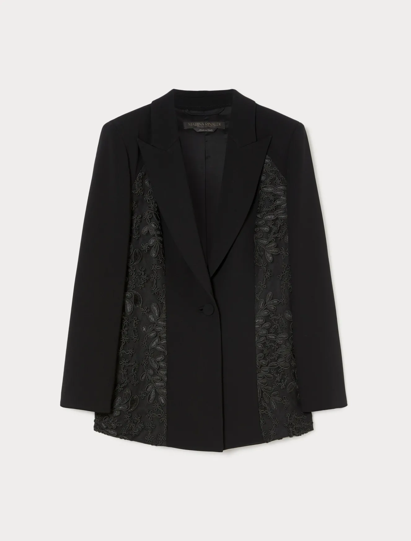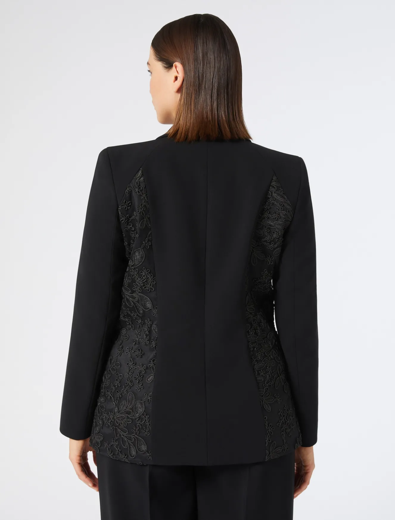 Diese Jacke aus Triacetat-Cady ist mit vertikalen Einsätzen auf der Vorder- und Rückseite aus luxuriösem Tüll mit Cordonet-Stickerei gefertigt.