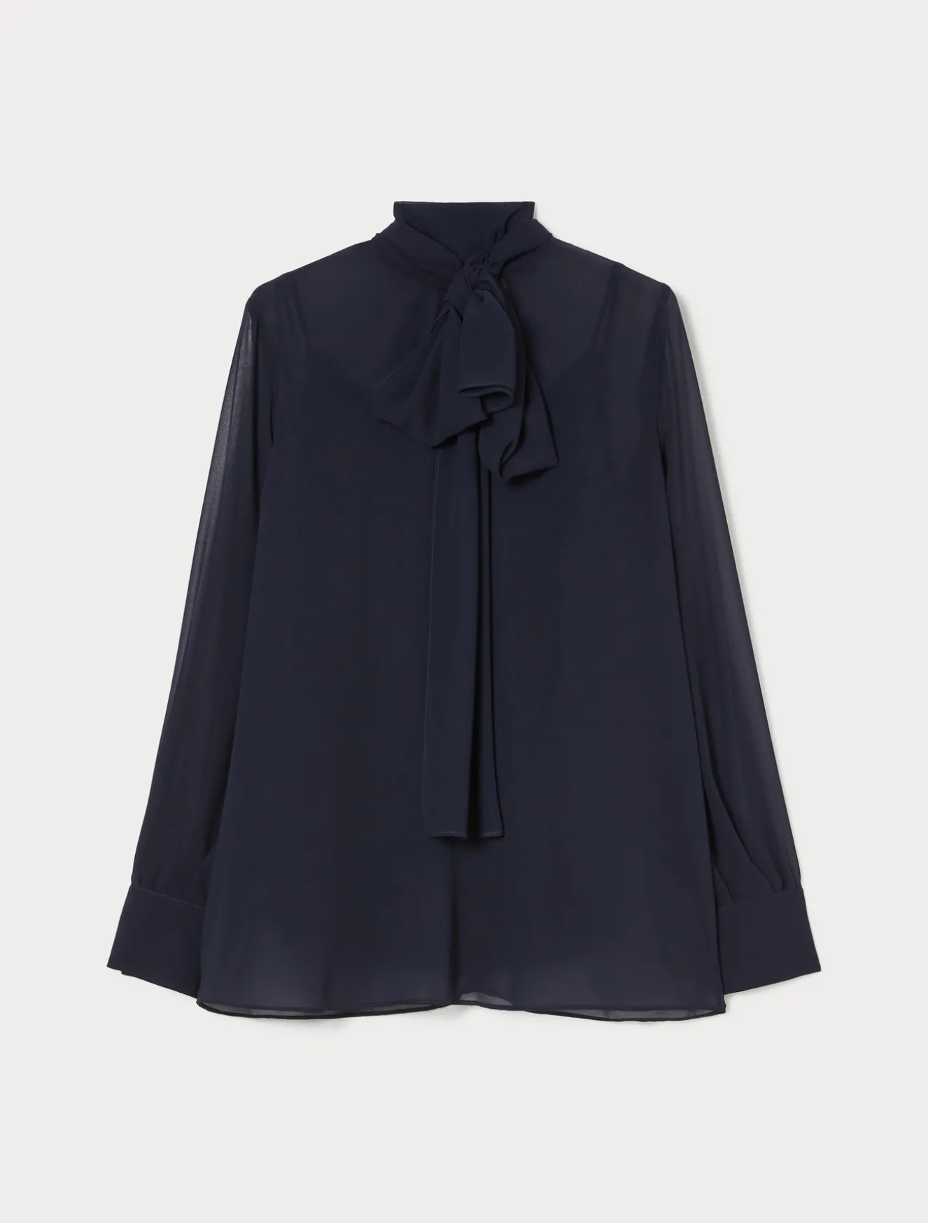 Diese gerade geschnittene Bluse aus Georgette-Crêpe rundet jegliches Outfit perfekt ab. Sie können die Schärpe, die am Hals angenäht ist, zu einer Schleife binden oder offen tragen.