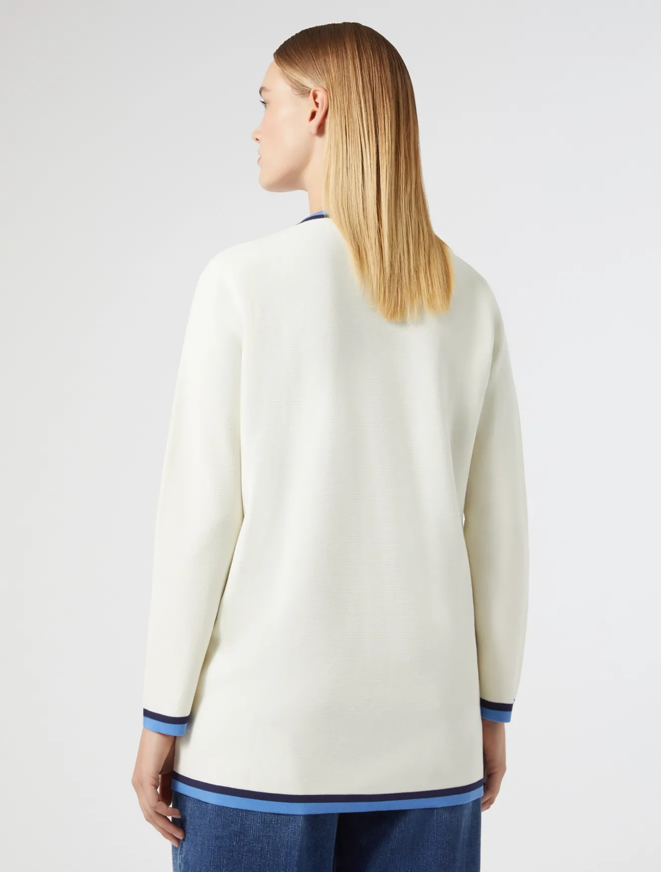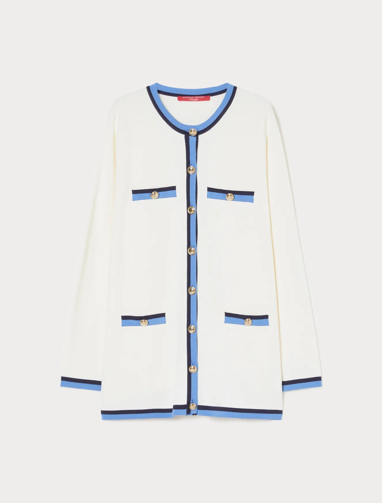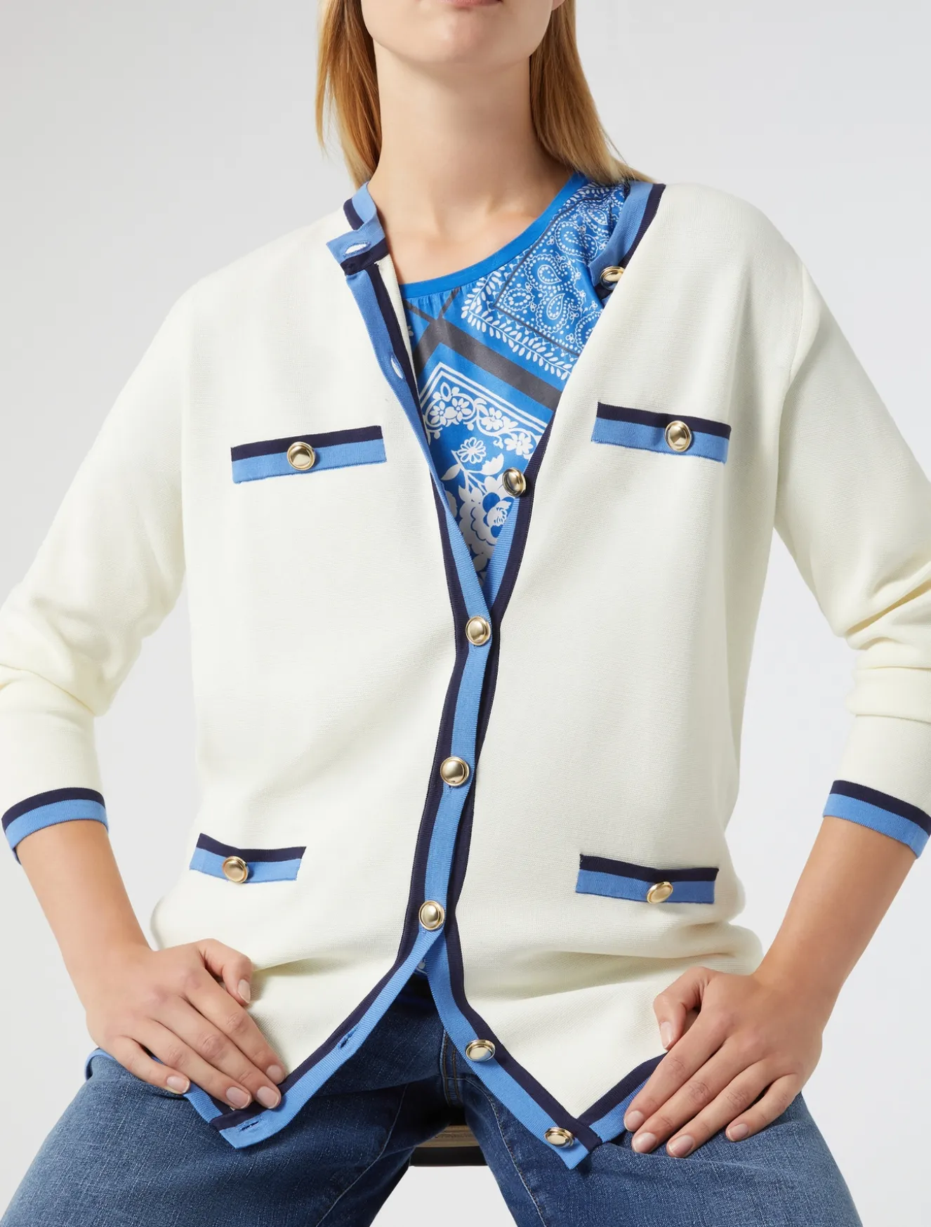 Dieser Cardigan aus Crêpe-Baumwolle besticht durch seinen besonderen Charme. Er ist mit kontrastfarbigen, gestreiften Patten und Öffnungen verziert. Ideal mit den der dazu passenden Hose kombinierbar.