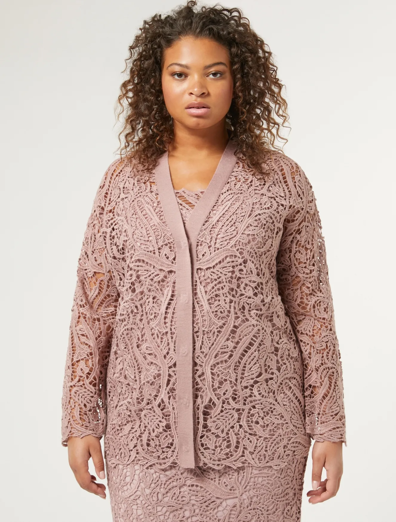 Ein raffiniertes Makramee-Gewebe mit einzigartigem Disegno macht diesen Cardigan mit Flachstrick-Rücken zu etwas ganz Besonderem. Ebenso ideal, um Festtags-Outfits zu ergänzen.Dieses Modell gehört zur Hauptkollektion von Marina Rinaldi.