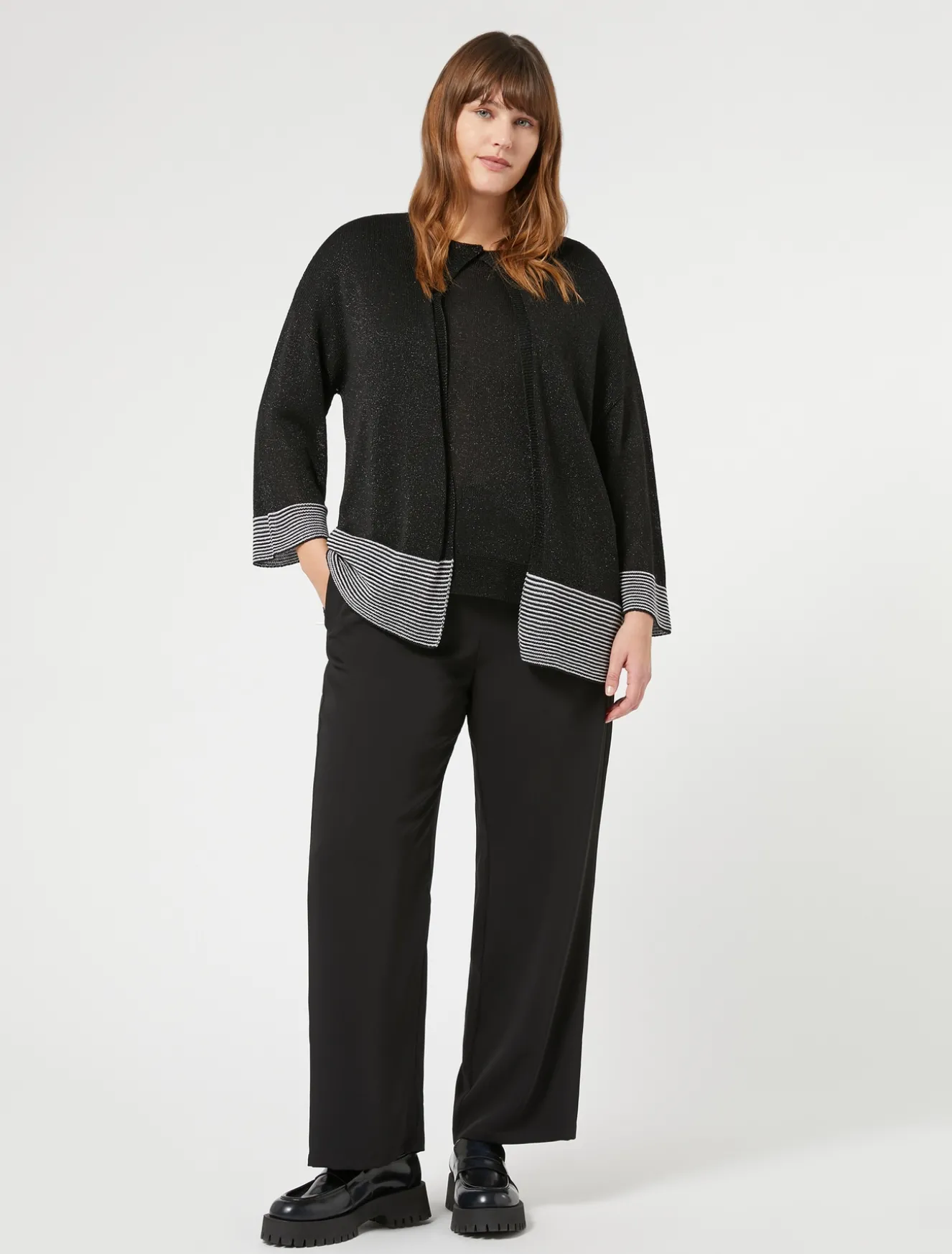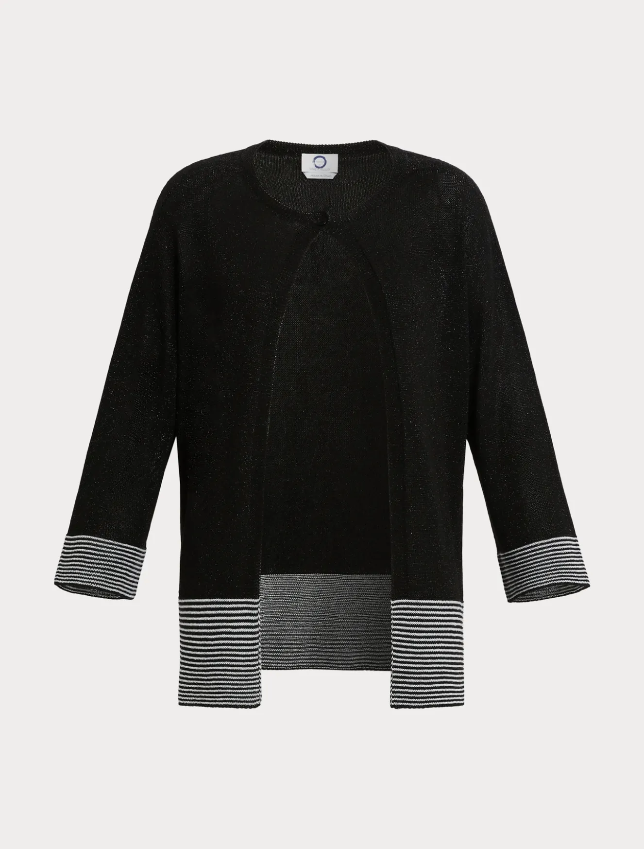 Der gerade geschnittene Cardigan ist aus Lurex-Viskosegarn gefertigt und besitzt ein Streifenmuster unten am Saum. Perfekt für einen eleganten Look.Das Kleidungsstück ist Teil der Kollektion „Voyage“.