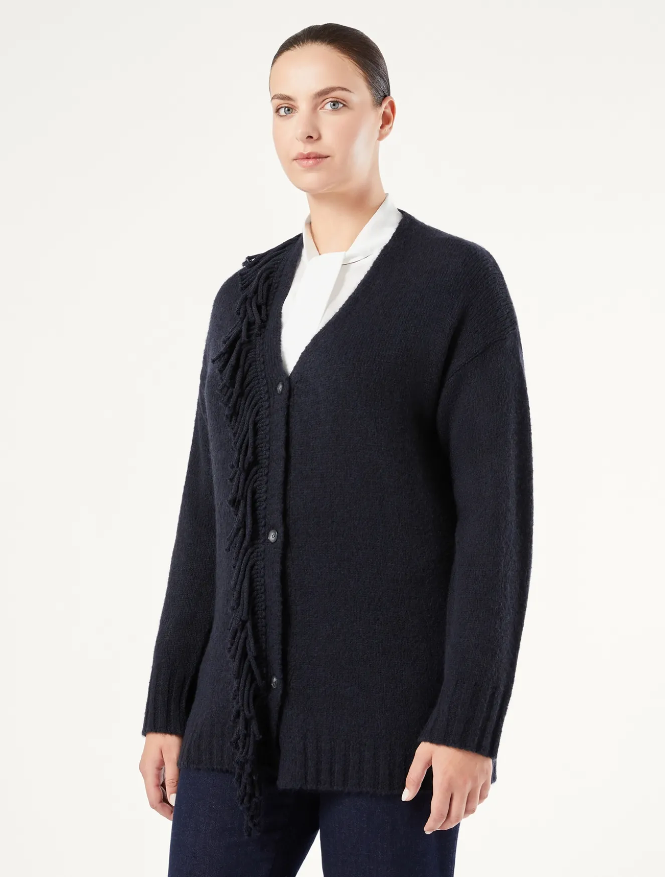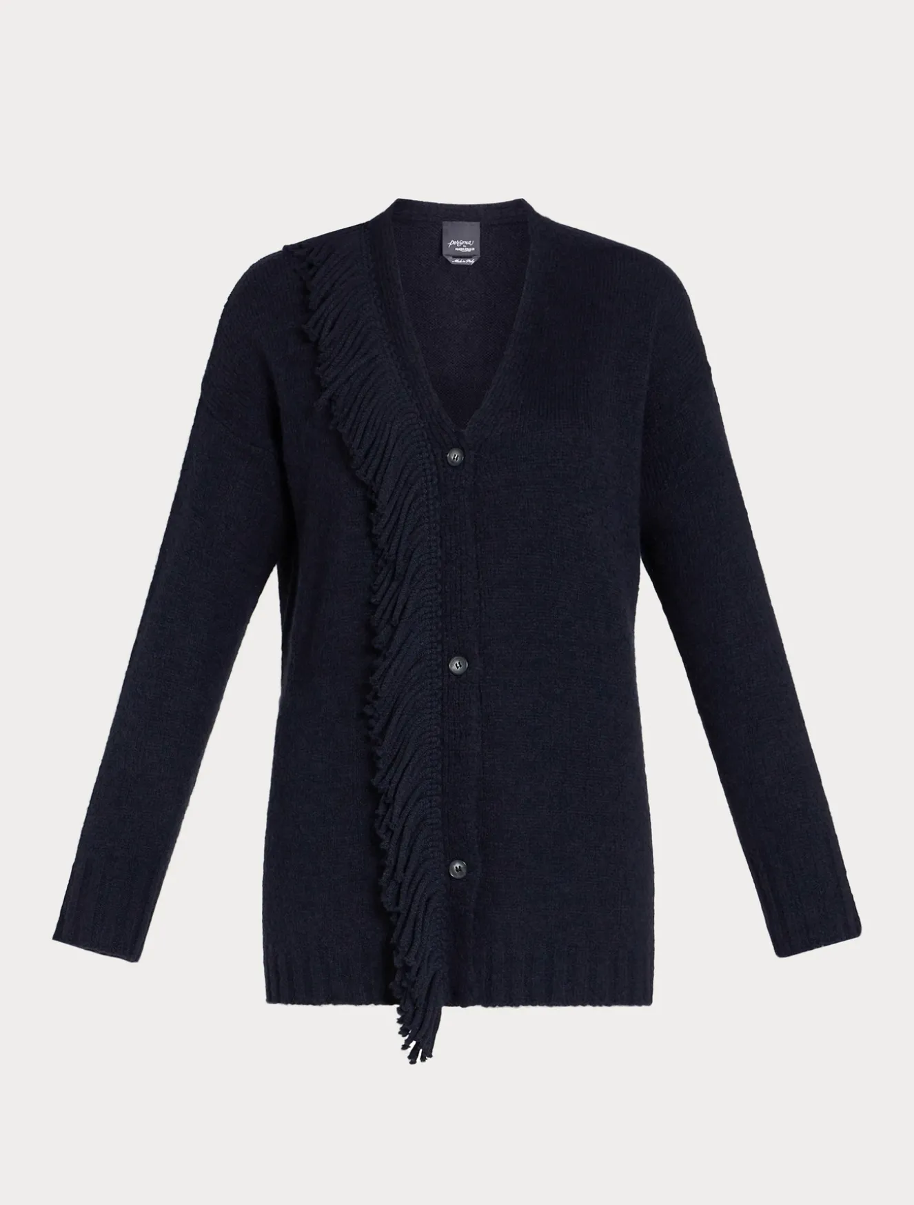 Cardigan mit stylischen Details aus kardiertem Wollgemisch mit V-Ausschnitt, langen Ärmeln und Fransendetails.Das Kleidungsstück ist Teil der Kollektion Persona by Marina Rinaldi.– Wollgemisch– Weiter Schnitt– V-Ausschnitt– Tief angesetzte Ärmel– Fransen– Gerippte Kanten