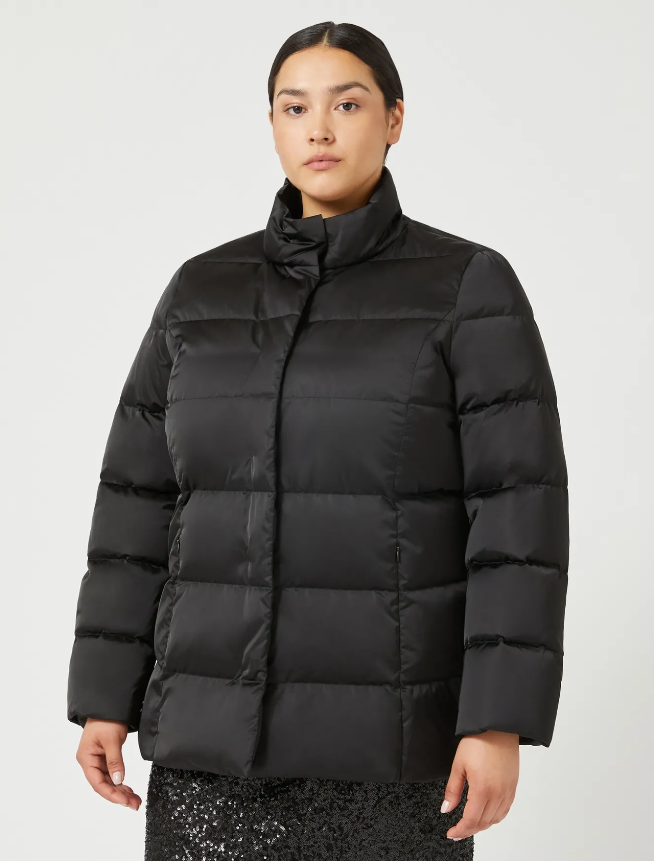 Daunenjacke aus Satin mit warmer Gänsedaunenfüllung, die sich durch stilvolle Details auszeichnet.Das Kleidungsstück ist Teil der Kollektion Persona by Marina Rinaldi.– Satin– Leicht engere Passform– Stehkragen mit abnehmbarem Lapinkragen– Lange Ärmel– Druckknopfverschluss– In die Teilungsnähte eingelassene Eingrifftaschen mit Reißverschluss– Wattierung aus Gänsedaunen