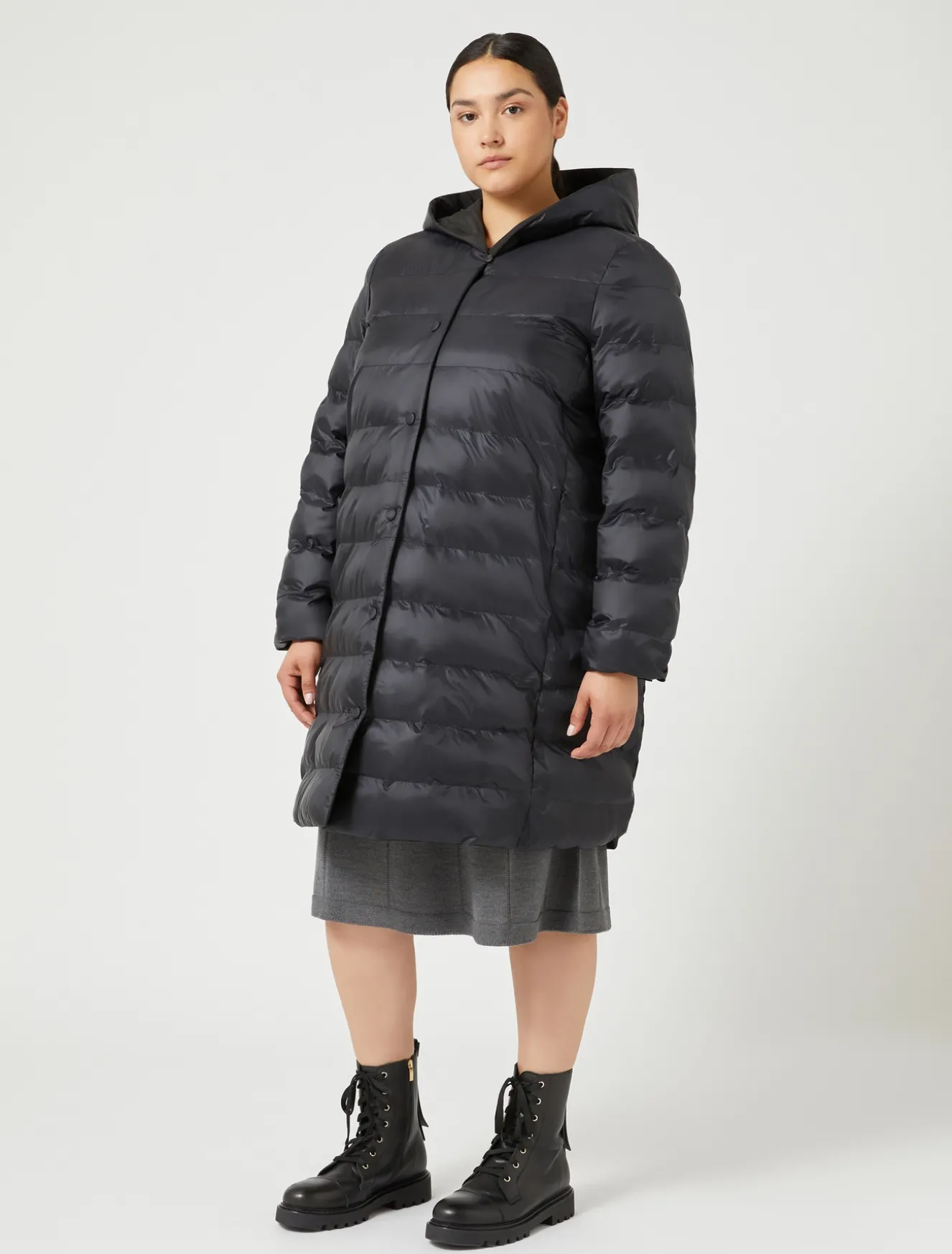 Diese wattierte Jacke aus Taft und wasserabweisendem Nylon-Canvas mit Druckknopfverschluss lässt sich vielseitig kombinieren.Das Kleidungsstück ist Teil der Kollektion Persona by Marina Rinaldi.– Taft, wasserabweisender Nylon-Canvas– Gerader Schnitt– Kragen mit Kapuze– Lange Ärmel– Druckknopfverschluss im selben Farbton– In die Teilungsnähte eingelassene Eingrifftaschen mit Reißverschluss
