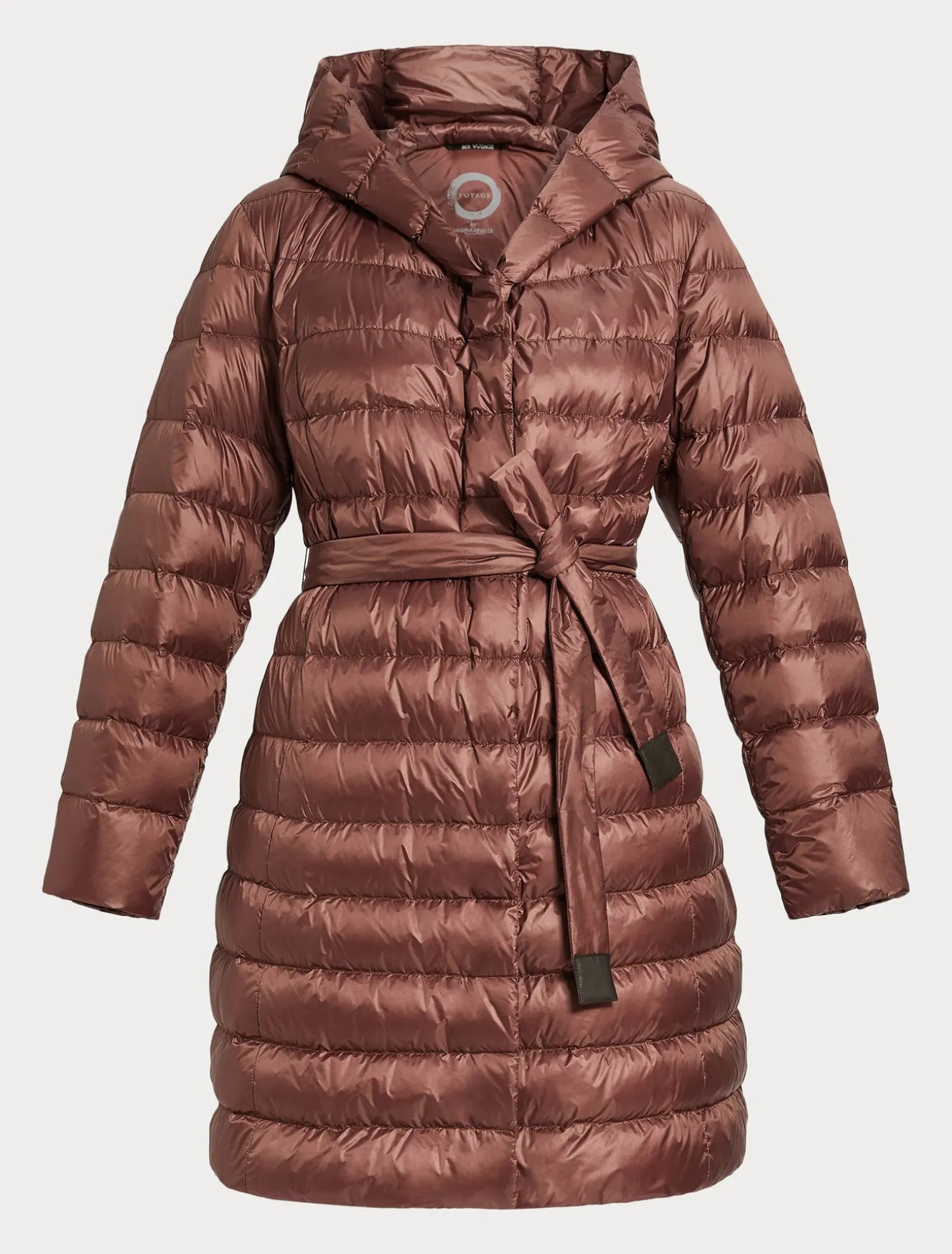 Eine transversale, moderne Daunenjacke mit einer Wattierung aus echten Gänsedaunen, die mit dem passenden Gürtel mit Lederenden an der Taille reguliert werden kann. Das Modell ist sehr leicht und bietet einen angenehmen Tragekomfort.Das Kleidungsstück ist Teil der Kollektion „Voyage“.
