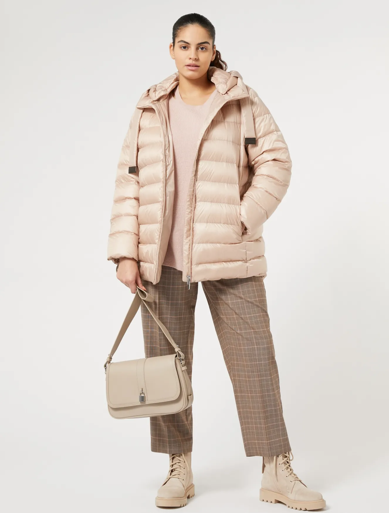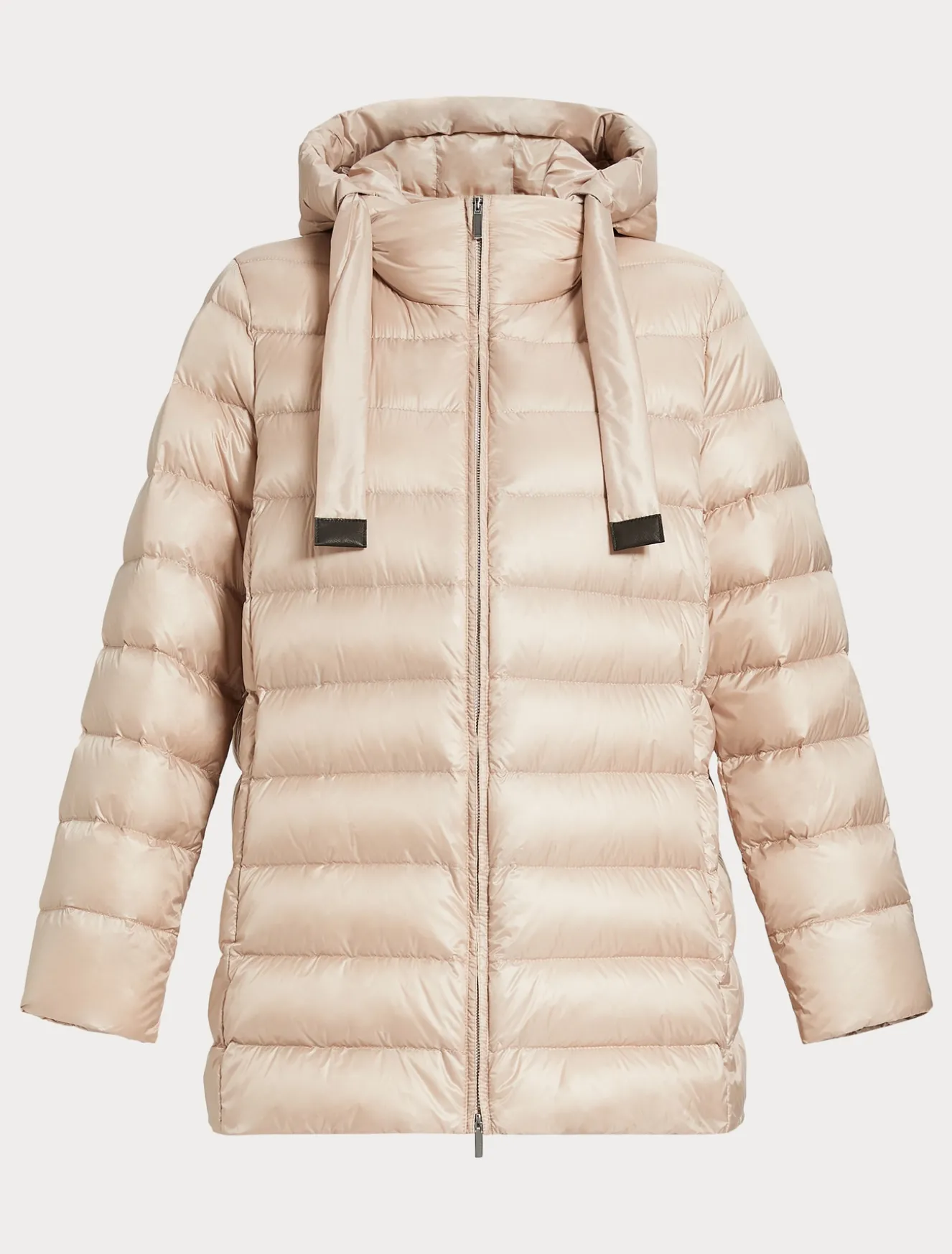 Kurze Daunenjacke mit Wattierung aus echte, Gänsedaunen mit horizontal gesteppten Streifen und einem Maxi-Tunnelzug mit Lederenden. Warm, edel und vielseitig.Das Kleidungsstück ist Teil der Kollektion „Voyage“.