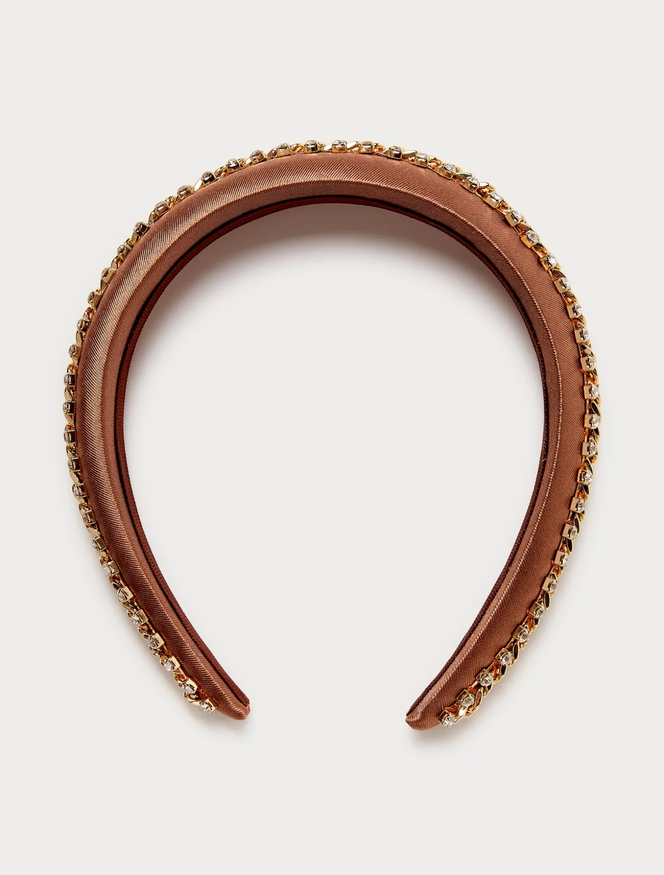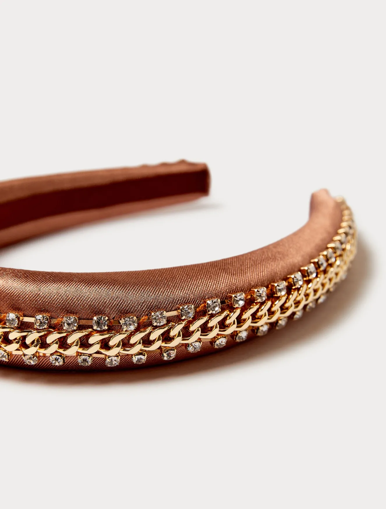 Dieser gepolsterte Satin-Haarreifen ist mit einer durchgehenden Metallkette und Strasssteinen verziert. Um besonderen Anlässen mit Stil zu begegnen.