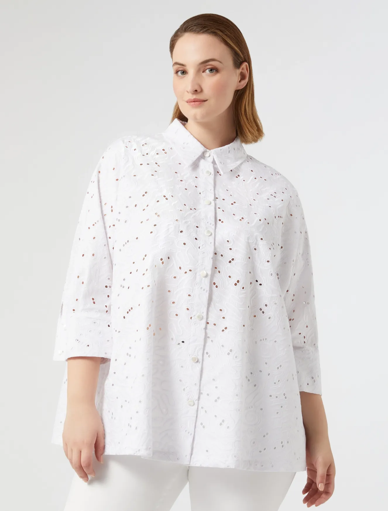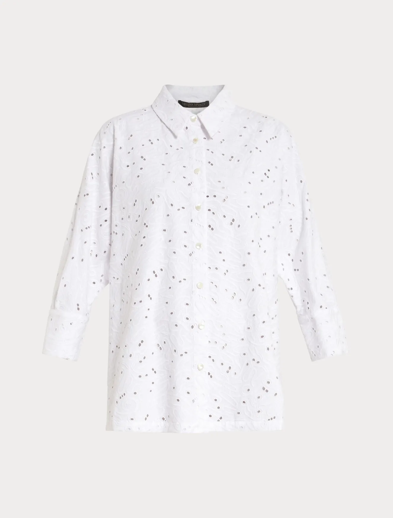 Gerade geschnittene Hemdbluse aus Baumwollpopeline mit exquisiter Lochstickerei. Verleiht jedem Outfit einen trendigen und raffinierten Look.Das Kleidungsstück ist Teil der Sonderkollektion von Sara Battaglia für Marina Rinaldi.