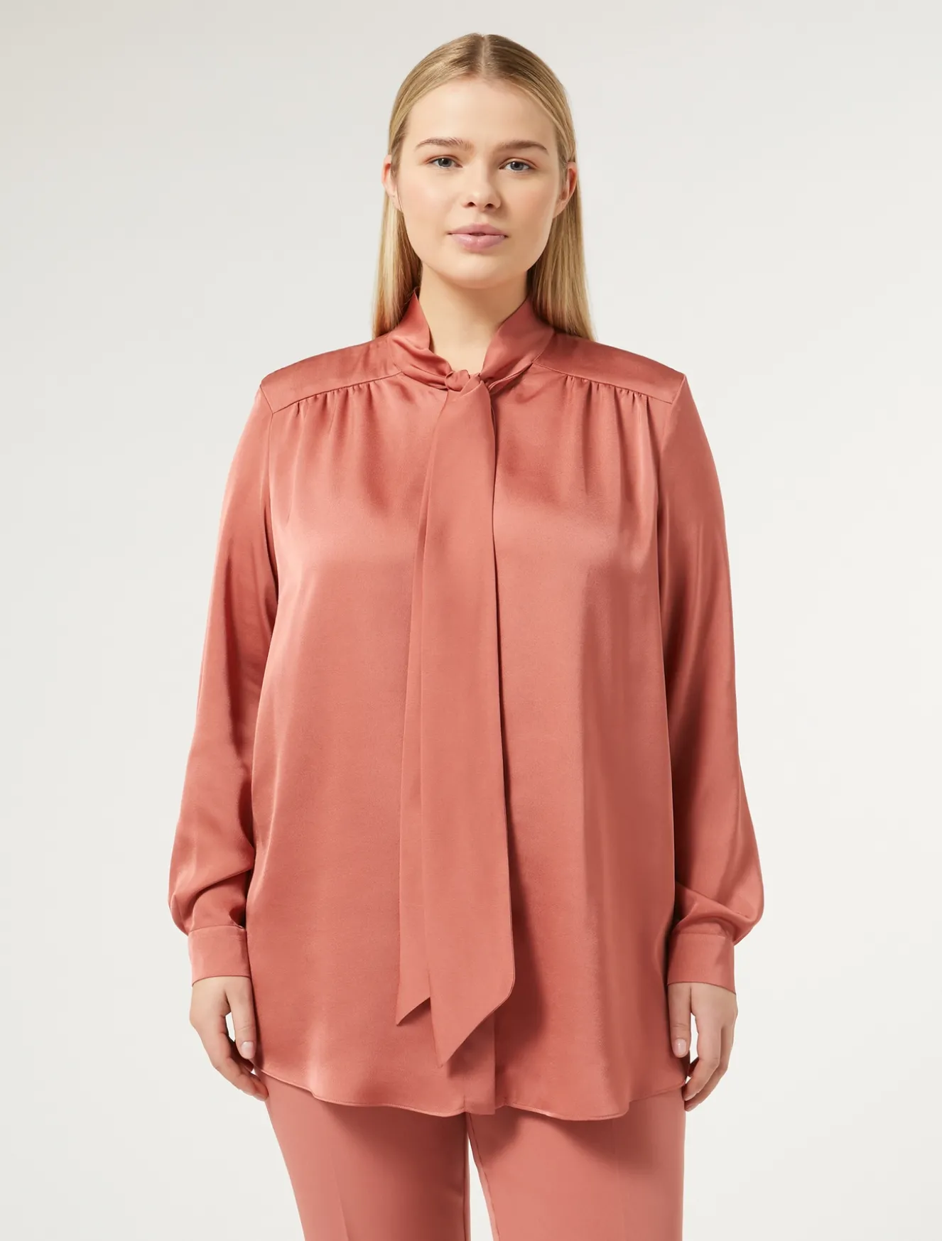 Hemdbluse aus Satin mit Schärpenkragen zum Binden und Raffungen für eine dynamische Schulterpasse, die sich durch Besätze und weitere Details auszeichnet.Das Kleidungsstück ist Teil der Kollektion Persona by Marina Rinaldi.– Satin– Gerader Schnitt– Stehkragen mit Schärpe– Lange Manschettenärmel mit stoffbezogenen Knöpfen– Stoffbezogene Knöpfe