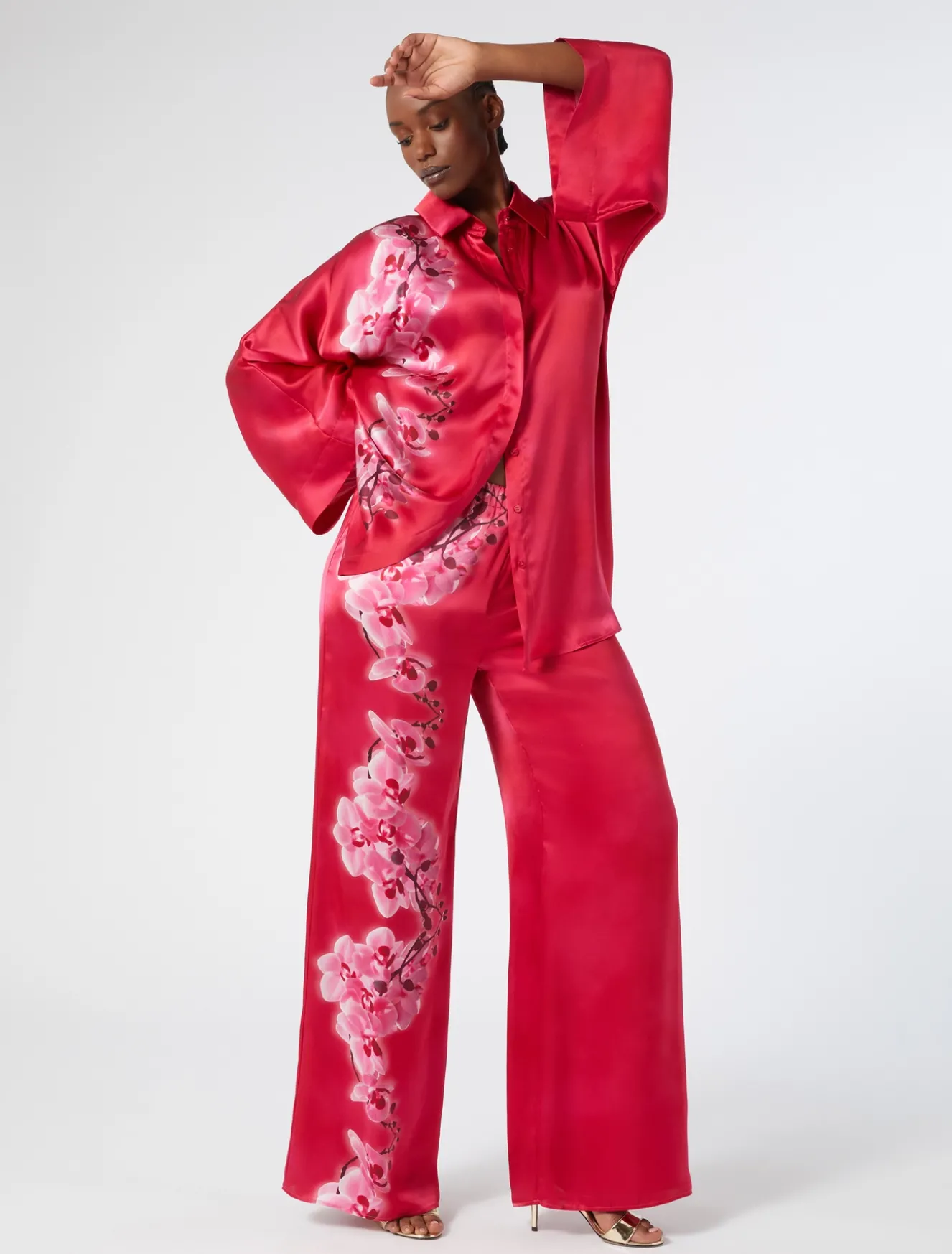 Ein raffinierter Orchideen-Print ziert diese Hemdbluse aus reinem Seidensatin. Ein grafischer Touch für einen edlen Stil. Das Design ist Teil der Kollektion Elegante.