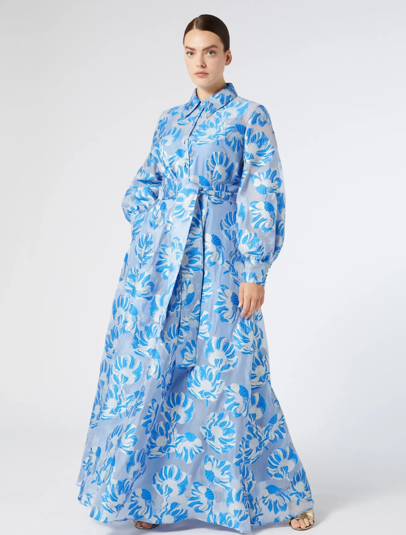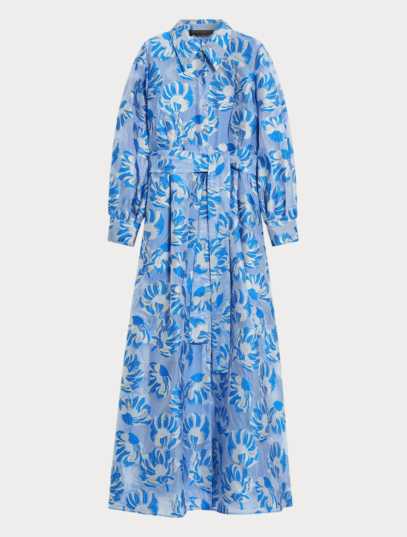 Langes Hemdblusenkleid aus Fil Coupé-Seide mit floralem Design und Zierknöpfen. Wird mit passendem Unterkleid aus Crêpe de Chine und Gürtel geliefert. Das feminine Design und das besondere Material sorgen für einen edlen Look.Das Modell ist Teil der Kollektion Elegante.– Fil-Coupé-Seide mit Blumenmuster– Tailliertes Oberteil und ausgestellter Rock– Hemdkragen– Lange, weiche Ärmel mit Rüschen – Schmuckknopfverschluss– Breite Manschetten mit Knöpfen– Seitliche Eingrifftaschen