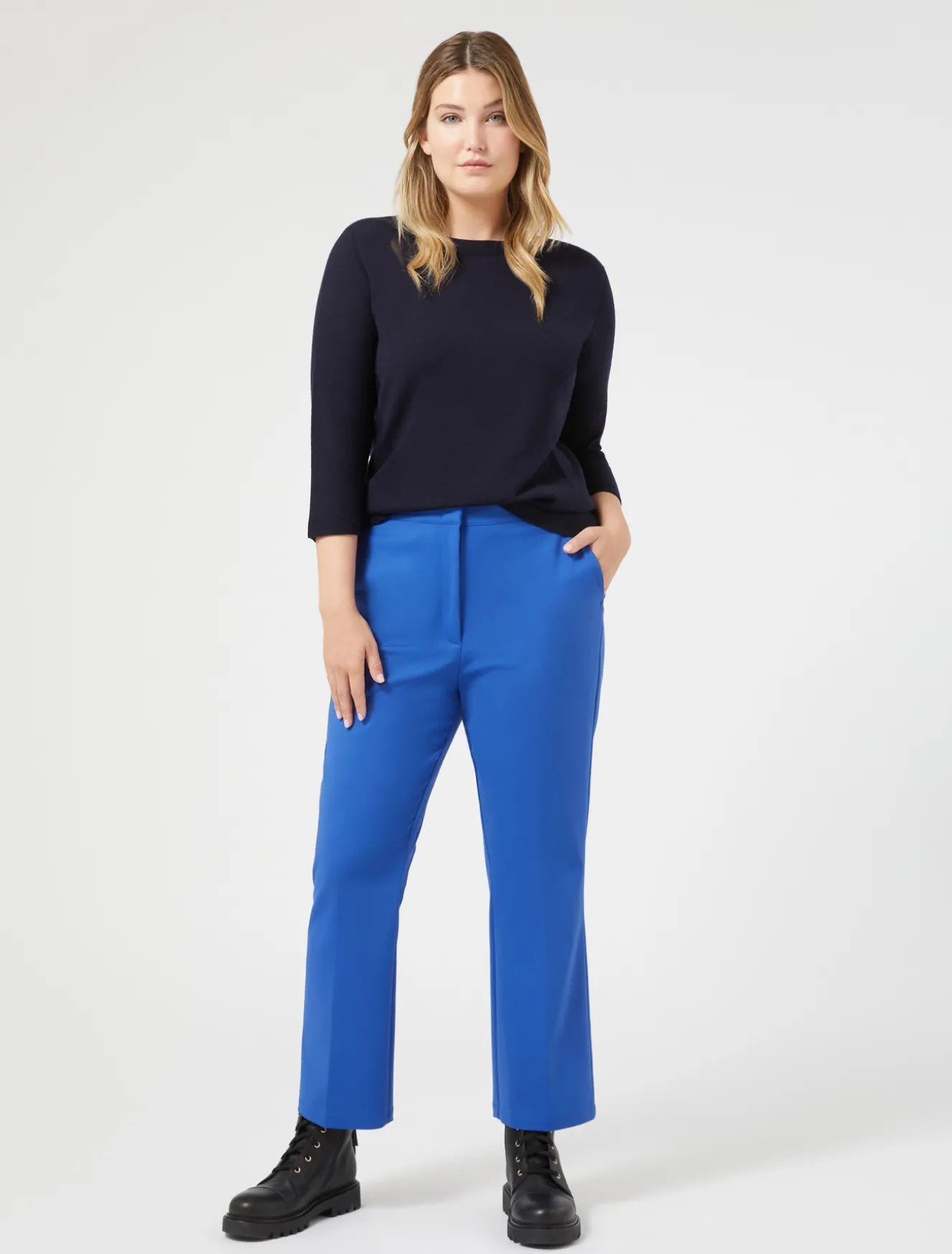 Diese vielseitige Flare-Hose ist aus Baumwolle und Nylon mit Stretchanteil gefertigt und mit einer Bügelfalte versehen. Das Gewebe ist angenehm zu tragen, knittert nicht und ist dazu auch nicht transparent. Das Kleidungsstück ist Teil der Kollektion „Voyage“.