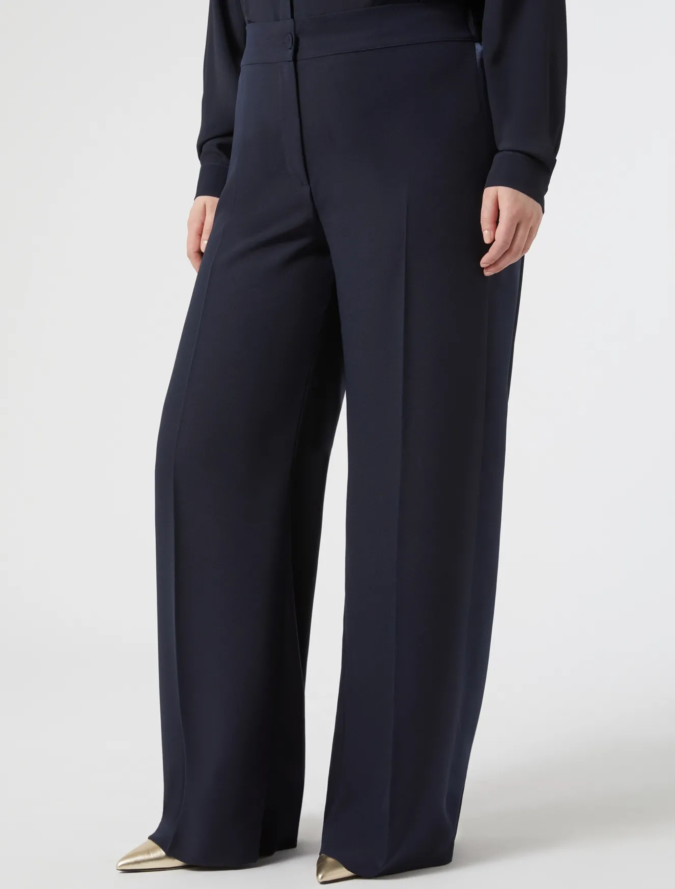 Hose aus Envers-Satin-Krepp mit glänzenden Bändern an der Seite für eine gelungene Smoking-Allüre. Weit geschnitten, um Ihren Outfits einen unerwarteten Touch zu verleihen.