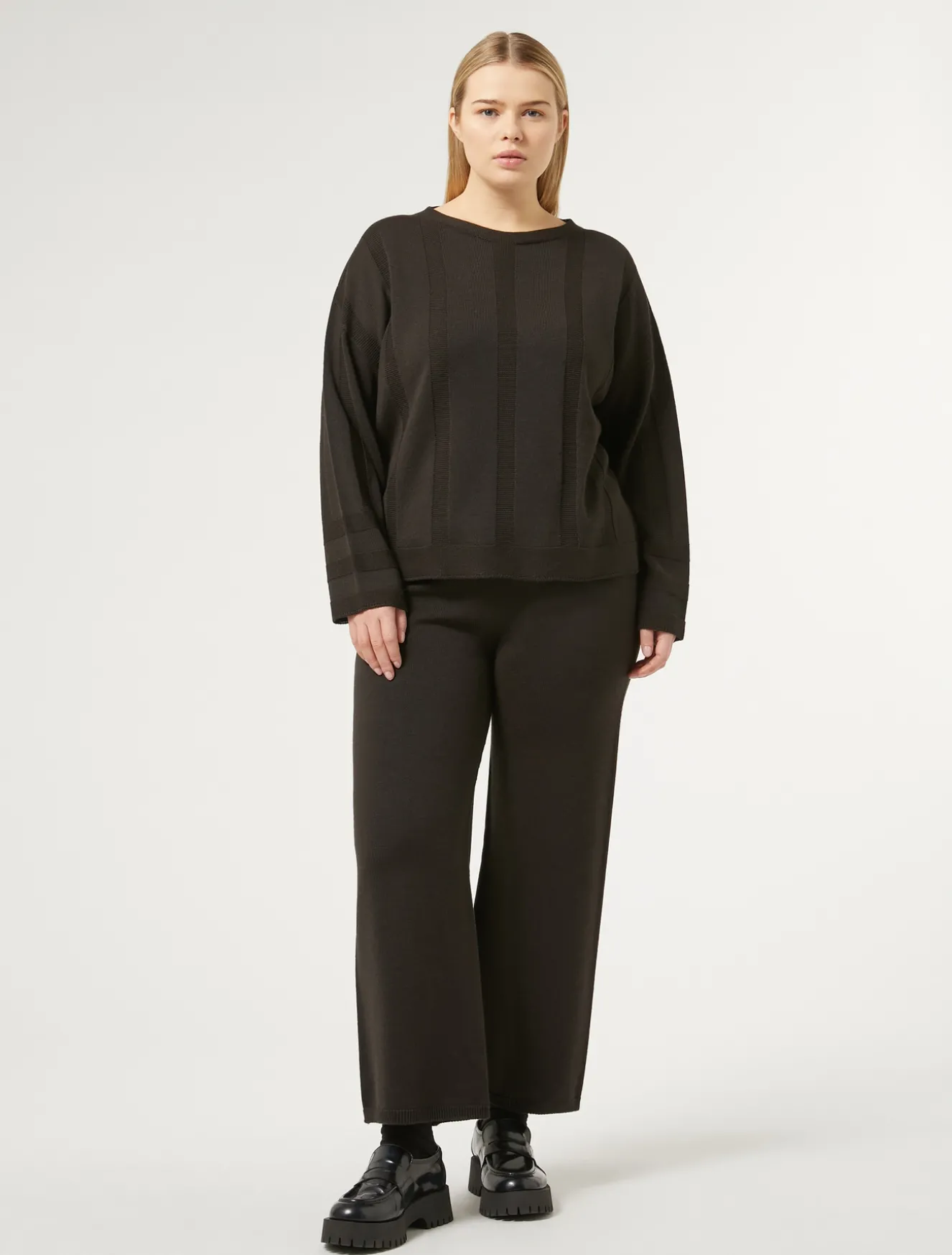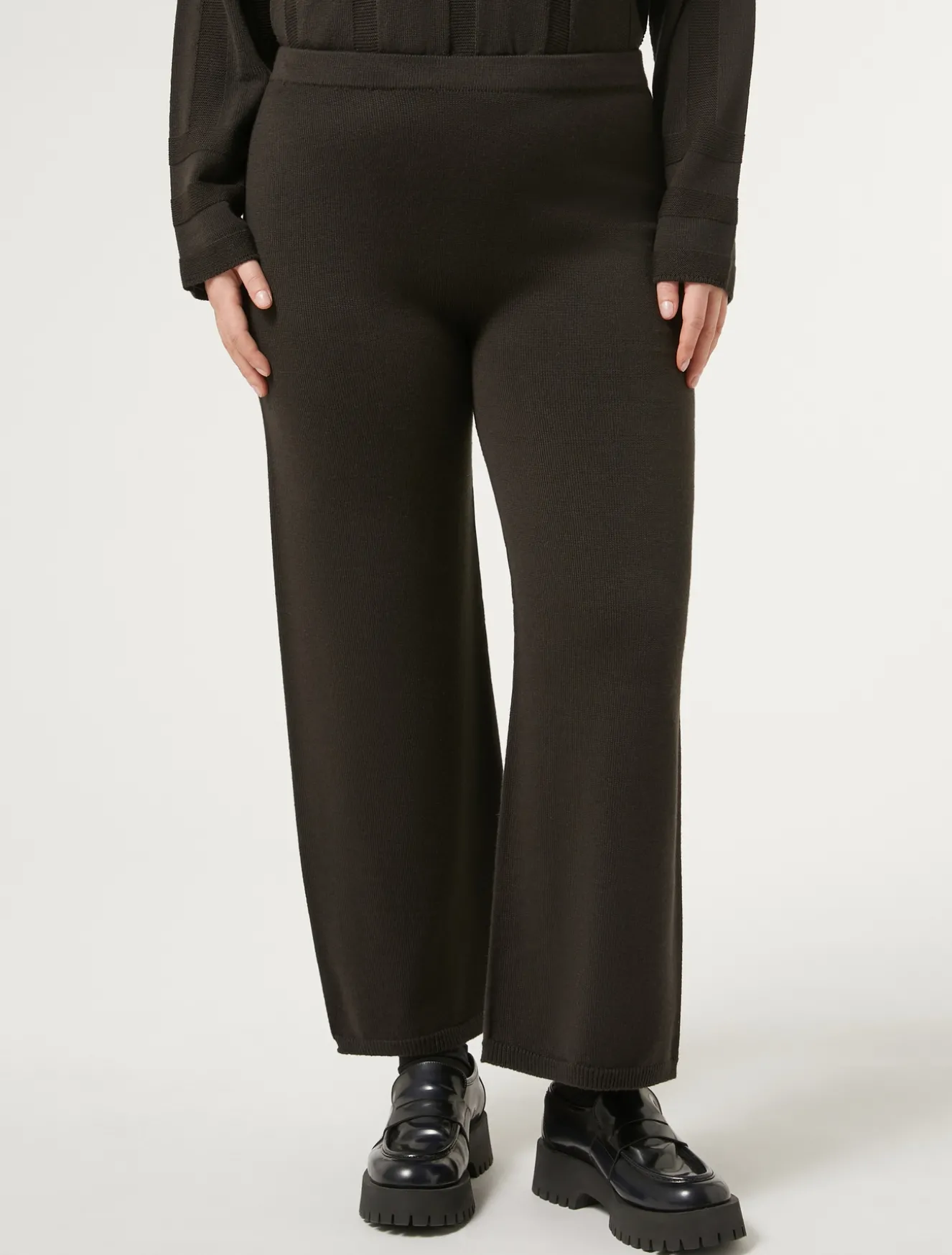 Stilvolle locker geschnittene Hose aus Wollgemisch mit einem elastischen Einsatz am Bund für zusätzlichen Komfort. Gut zu kombinieren mit dem dazu passenden Cardigan.Das Kleidungsstück ist Teil der Kollektion Persona by Marina Rinaldi.– Wollgemisch– Weiter Schnitt– Breiter elastischer Bund– Verarbeitung im Glattstrick– Rippsaum