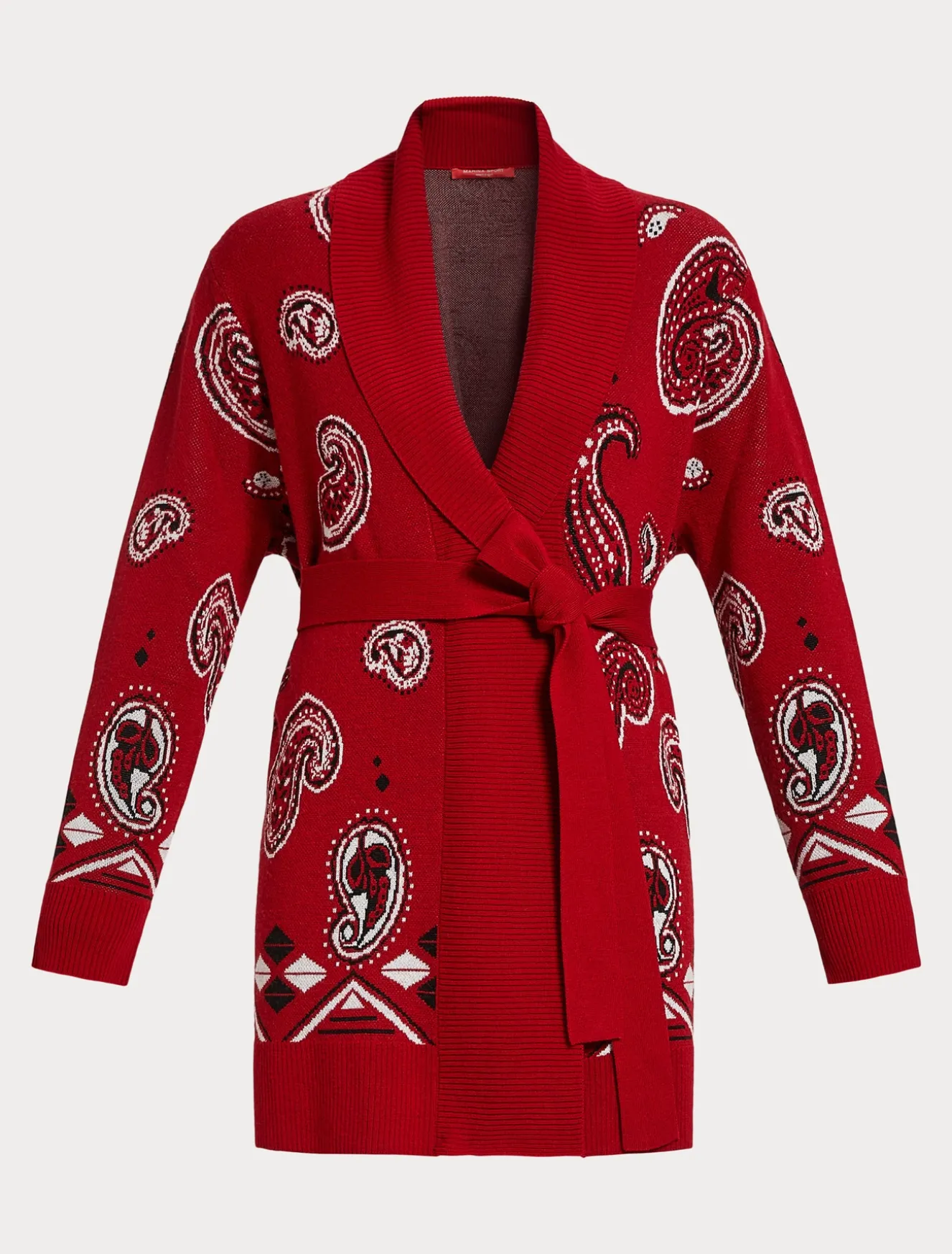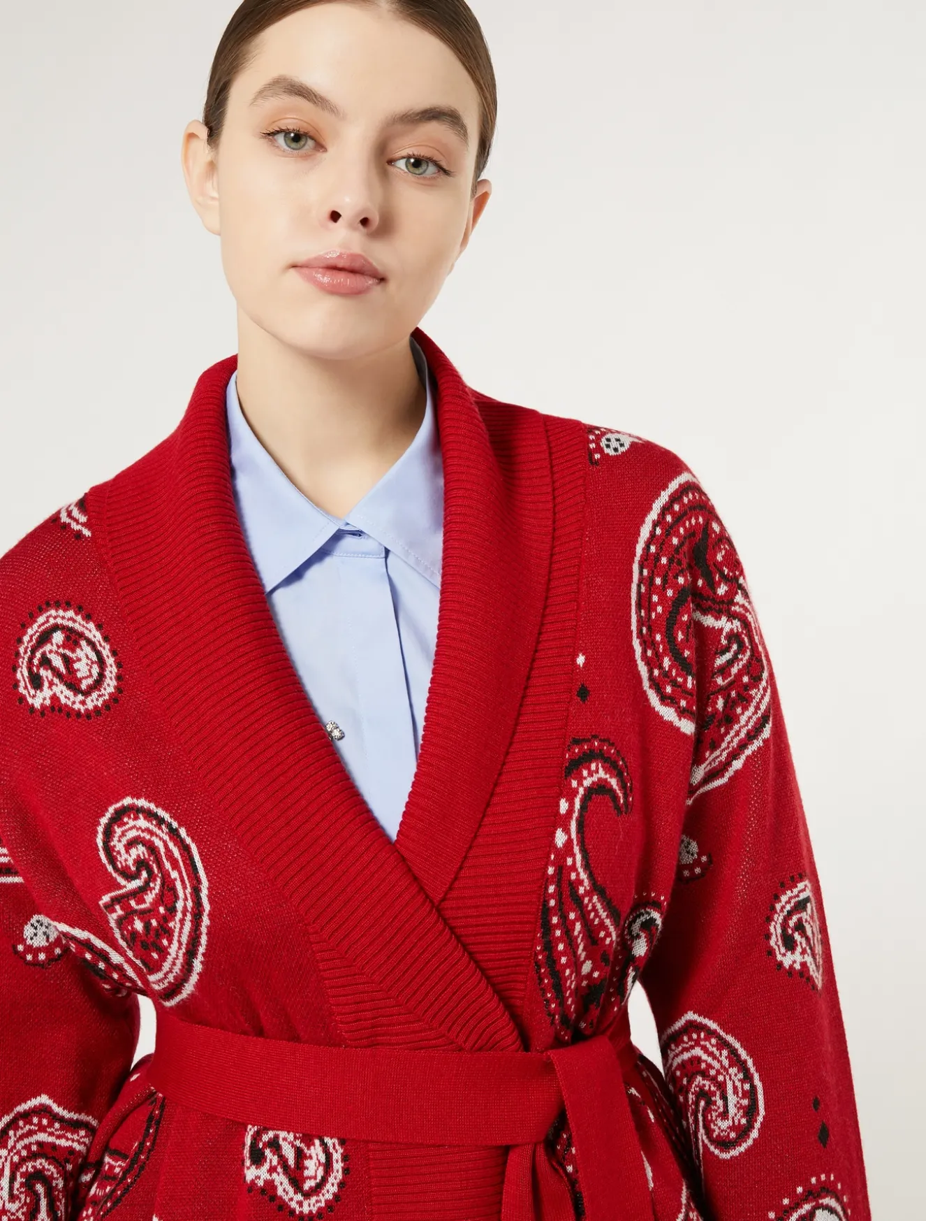 Grafischer Cardigan aus einem Wollmischstrick mit Piqué-Jacquard und gerippter Bordüre. Ein dazu passender Gürtel erlaubt, die Taille zu betonen und den Cardigan vorne zu schließen.Das Kleidungsstück ist Teil der Kollektion Marina Sport.