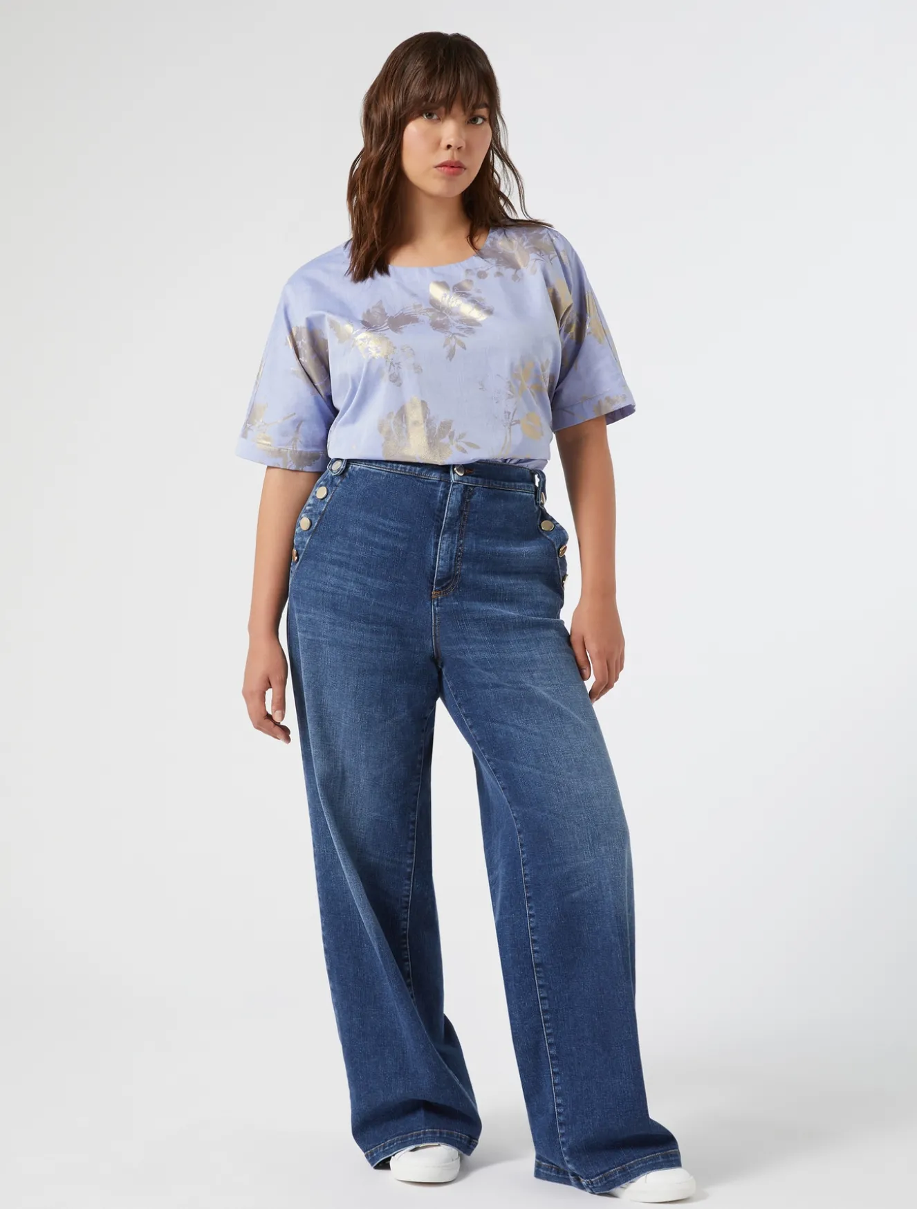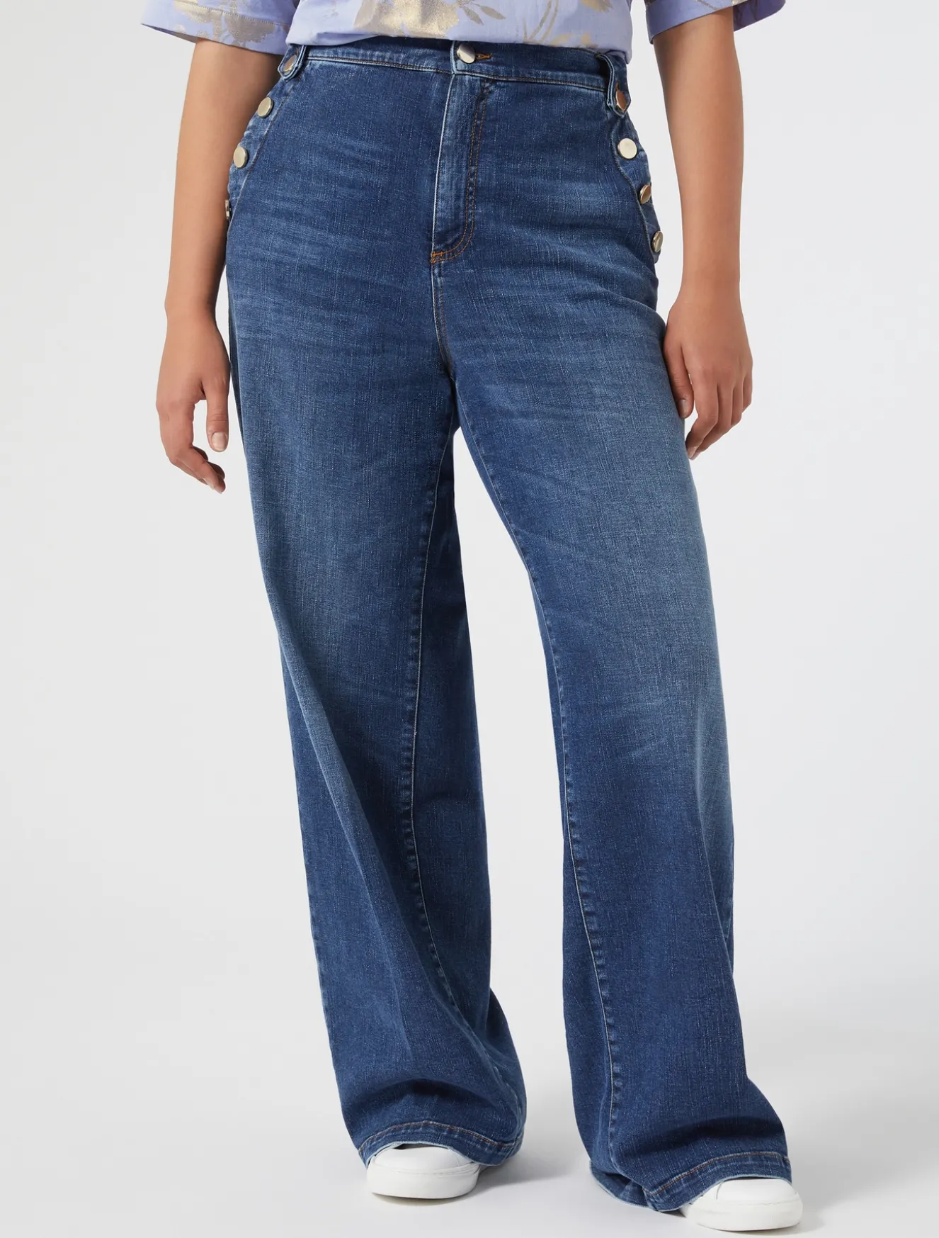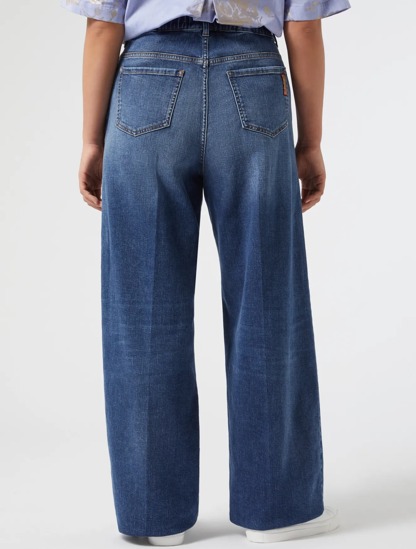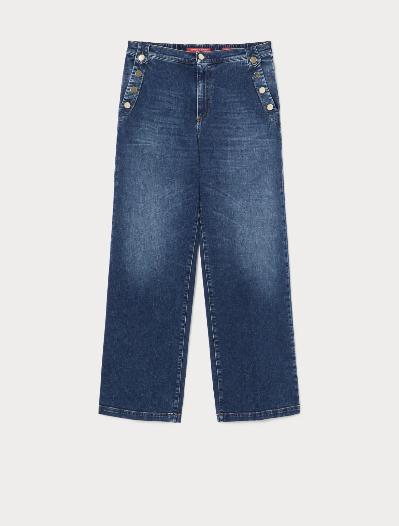 Hose aus stückbehandeltem, monoelastischem Baumwoll-Denim im Matrosen-Stil. Ein Modell, das den stilistischen Mittelpunkt bilden wird.