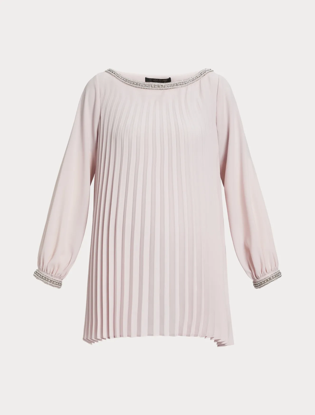 Der Kasack aus leichtem Crêpe mit Plissee-Solei ist an Kragen und Bündchen mit handgestickten Perlen und Strasssteinen verziert. Ein edles Modell für wichtige Veranstaltungen.Das Kleidungsstück ist Teil der Kollektion Elegante.