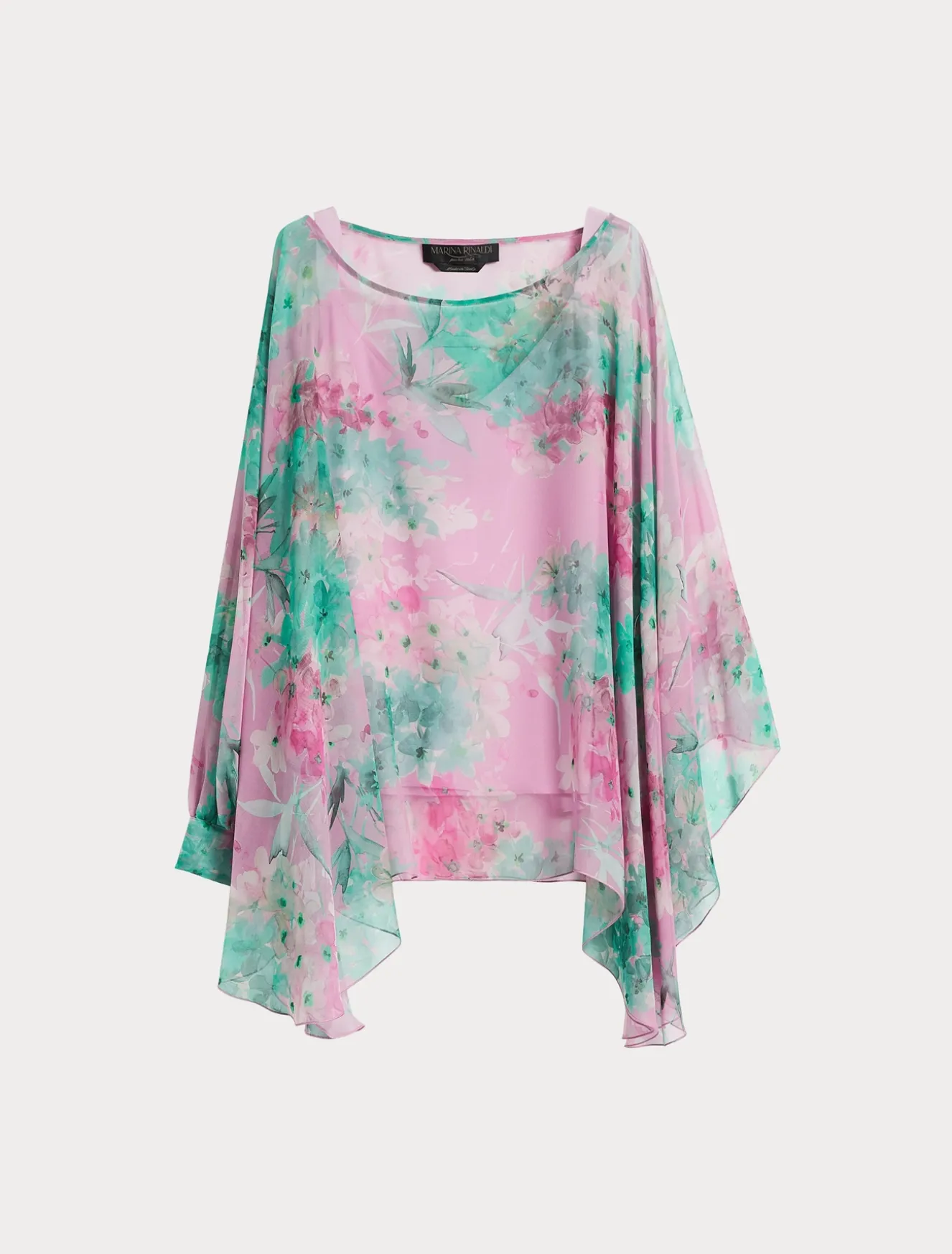 Kasack aus reinem Seiden-Georgette mit exklusivem Bouquet-Print und besonderem Design. Er hat einen Hemdärmel mit breiten Manschetten und Schmuckknöpfen sowie einen Poncho-Ärmel.Das Kleidungsstück ist Teil der Kollektion Elegante.