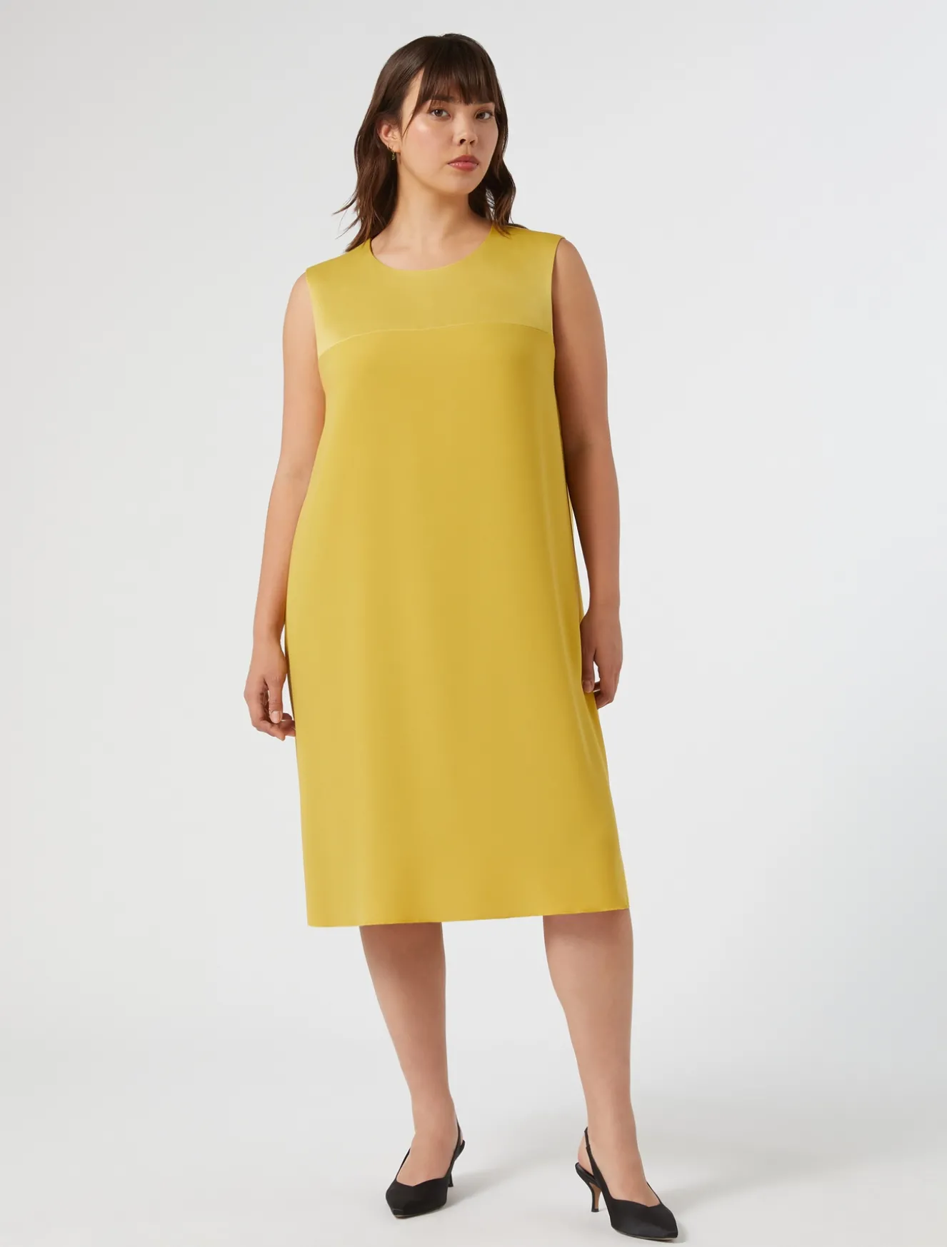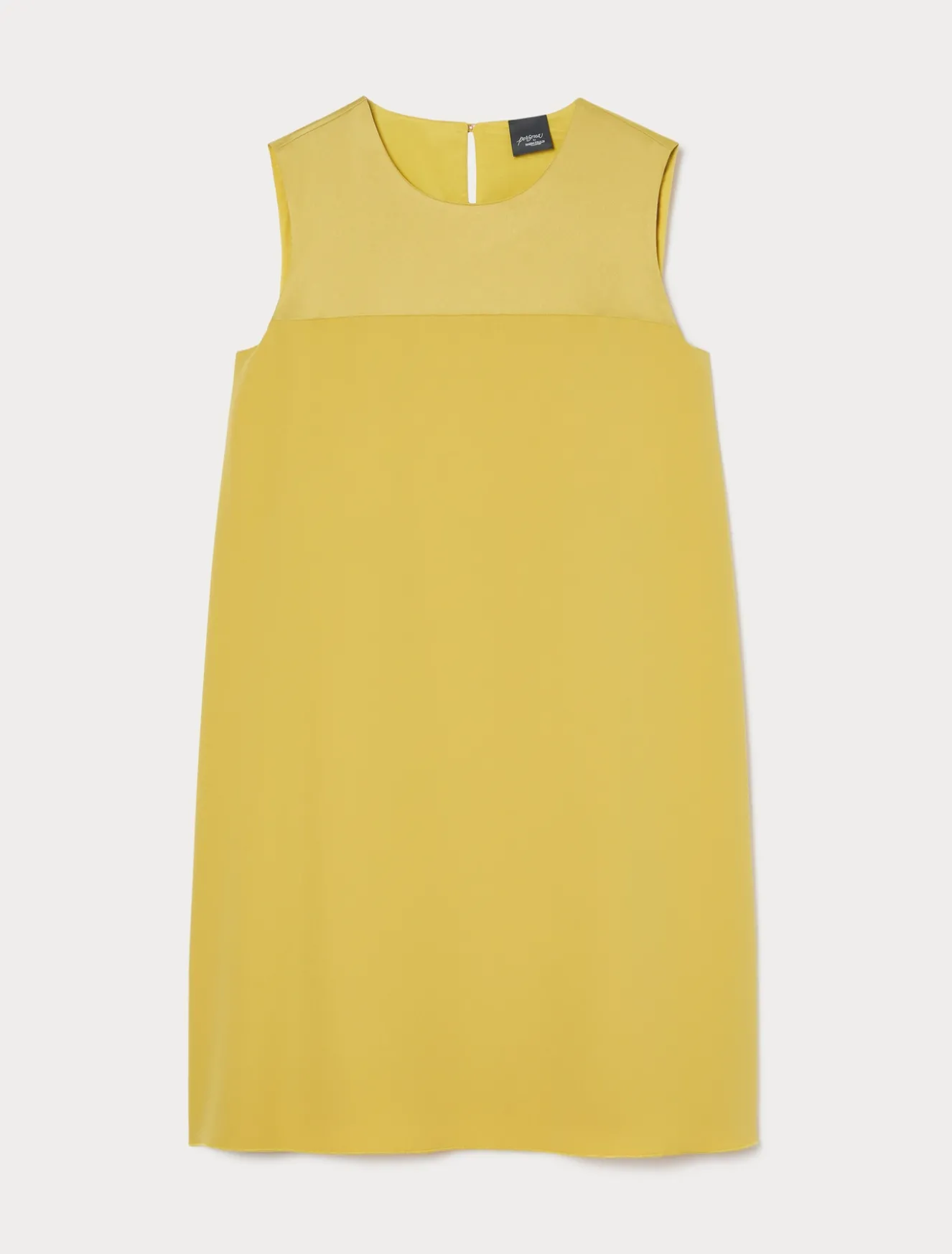 Kleid in A-Linie aus mattem Envers-Satin-Krepp, mit Passe und Seiten aus glänzendem Stoff. Die mitgelieferten kurzen Ärmel können jederzeit von einem Schneider angebracht werden.