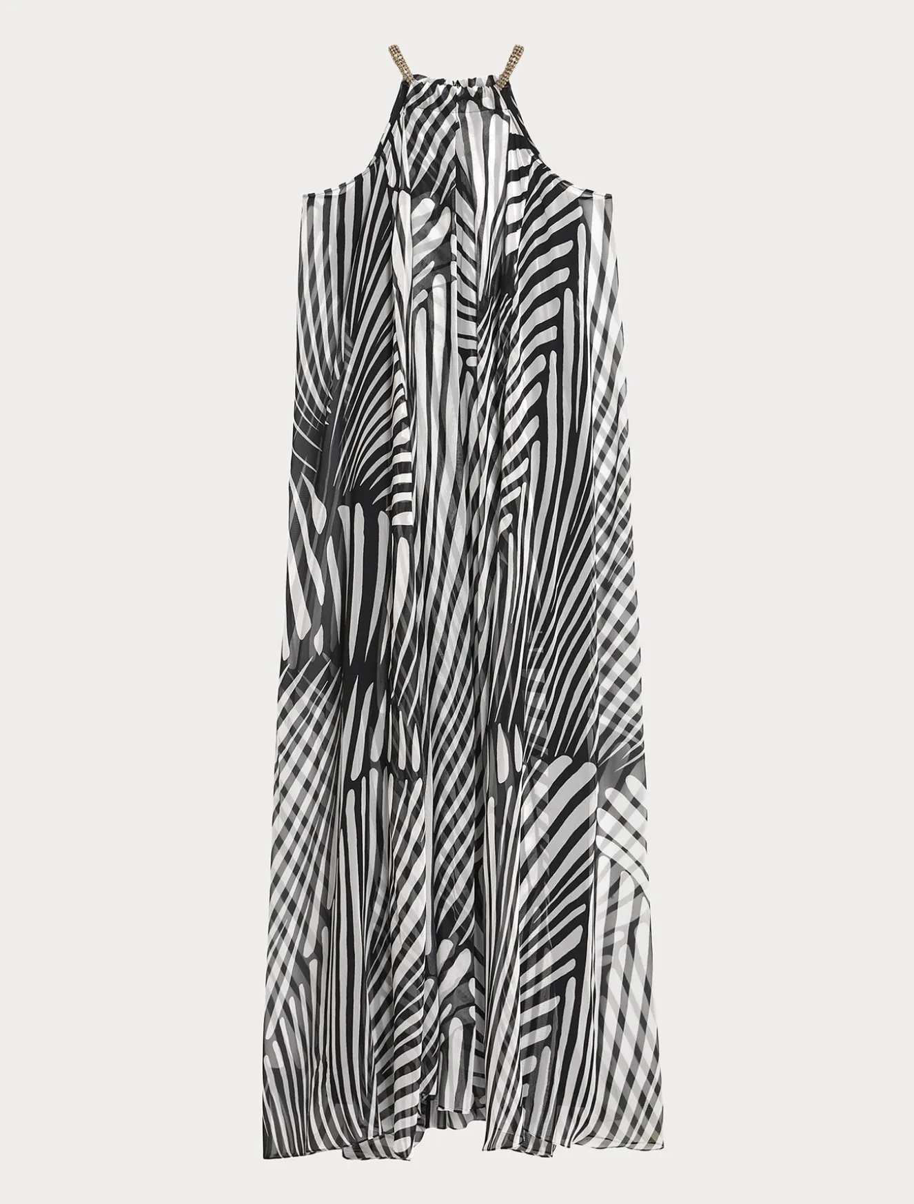 Langes Kleid aus reinem Seiden-Georgette mit weiter Passform und exklusivem Grafikprint. Du kannst das Oberteil mit Trägern und Schulterausschnitt tragen oder deine Arme durch die Aussparungen stecken und es als ärmelloses Kleid tragen.Das Modell ist Teil der Kollektion Elegante.– Reiner Seiden-Georgette– Rundhalskette mit Strass– Verdeckter Reißverschluss hinten– Futter aus Crêpe de Chine-Seidengemisch– Schmale Träger im Lieferumfang enthalten