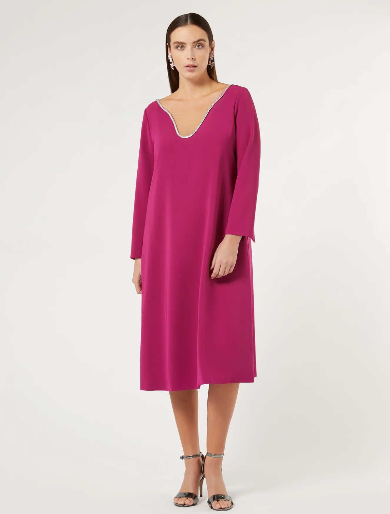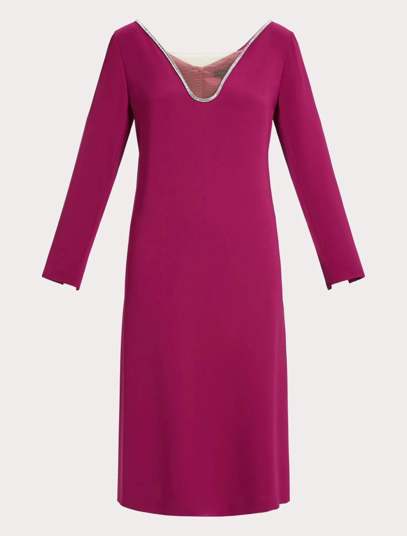 Das Kleid aus Triacetat-Cady, einem fließenden, pflegeleichten Material, das Problemzonen kaschiert, ist mit einer von Hand angebrachten Applikation im Baguette-Stil verziert. Weiter, geformter Ausschnitt vorne und hinten mit Tülleinsatz vorne.Das Kleidungsstück ist Teil der Kollektion Elegante.