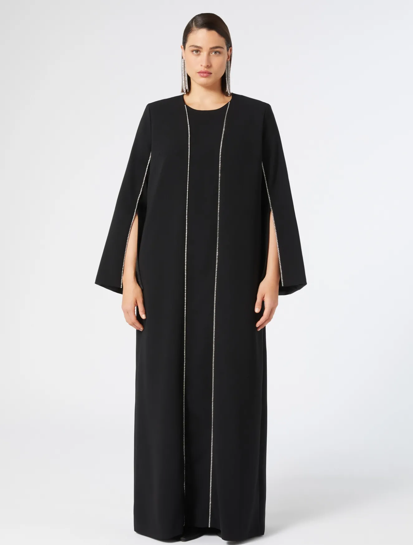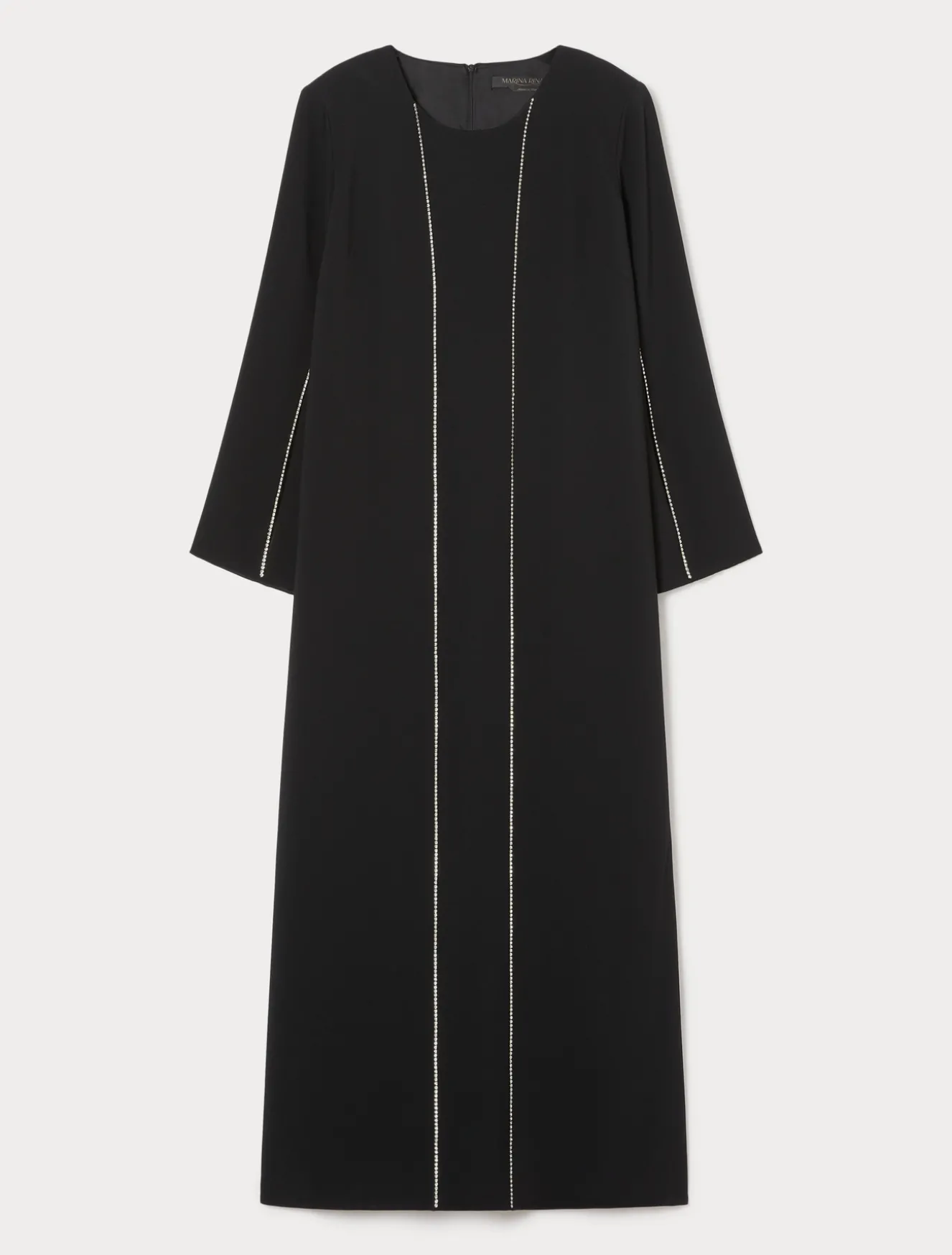 Dieses Kleid aus Triacetat-Cady ist mit Schmucksteinen besetzt, während vertikale Abnäher und die Ärmel für einen Overcoat-Effekt sorgen.
