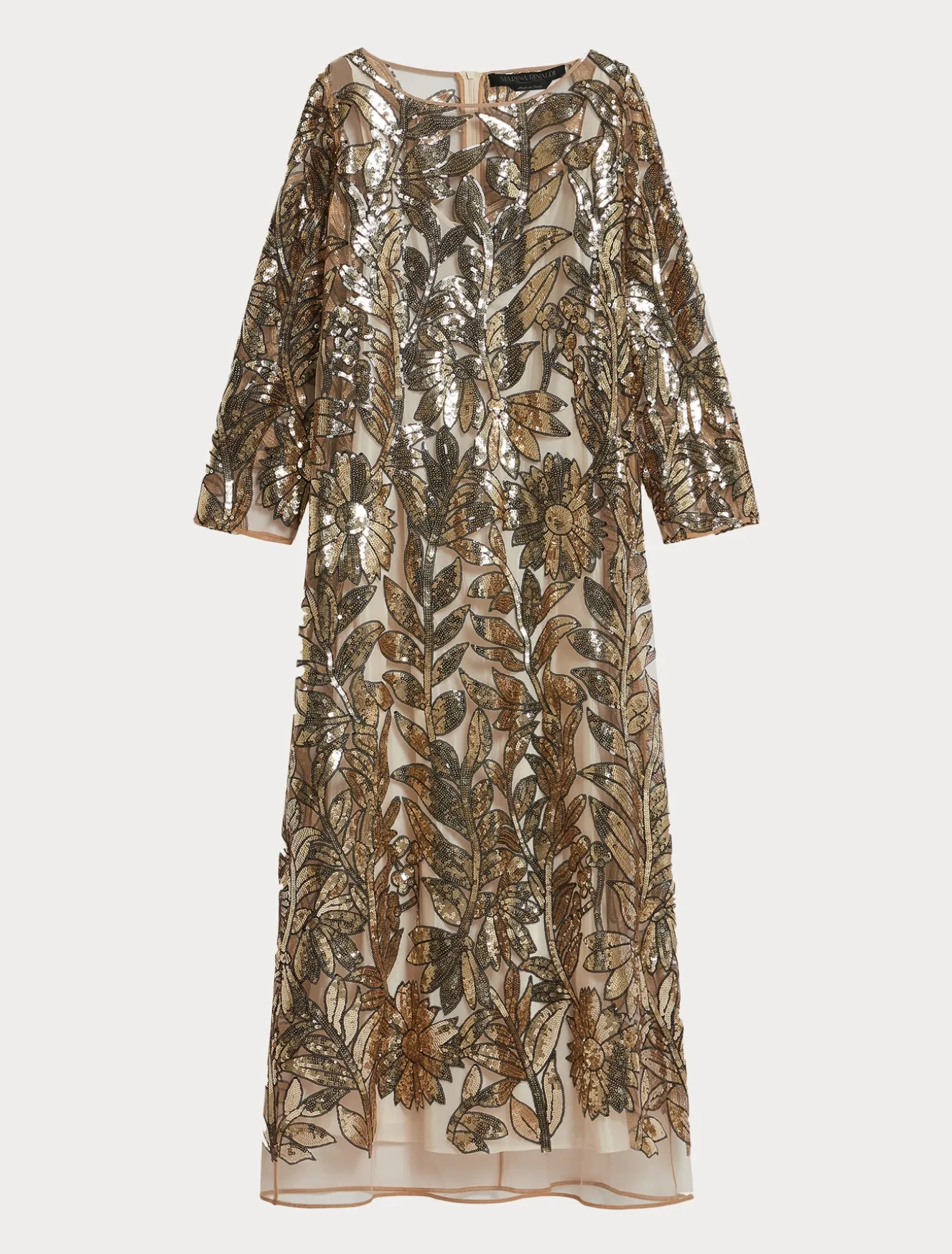 Kleid aus zartem Tüll mit floraler Placement-Stickerei mit Pailletten. Feminine Eleganz für einen besonderen Abend oder ein wichtiges Event.Das Modell ist Teil der Kollektion Elegante.– Tüll mit Pailletten-Blumenstickerei– Am Saum leicht ausgestellt– Rundhalsausschnitt– Lange Ärmel– Reißverschluss hinten– Passendes Unterkleid aus Crêpe de Chine.