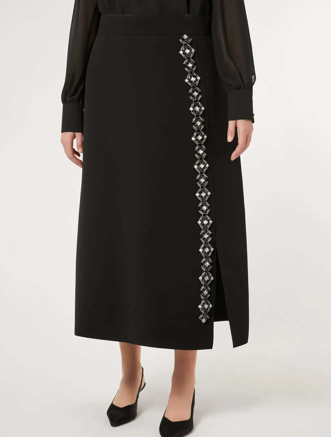 Der lange Rock aus Cady ist mit handbestickten Strasssteinen und handbestickten Beifahrern akzentuiert. Gut mit der passenden Jacke kombinierbar.Das Kleidungsstück ist Teil der Kollektion Elegante.