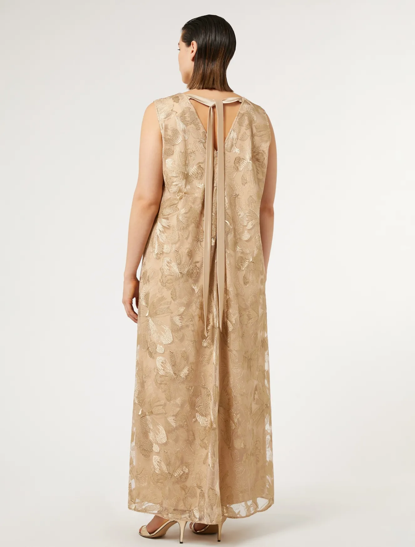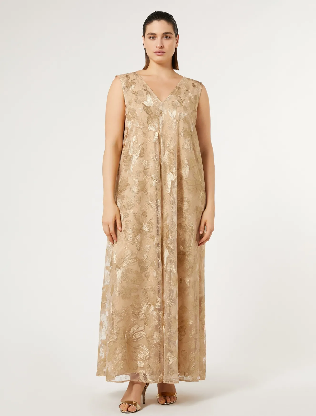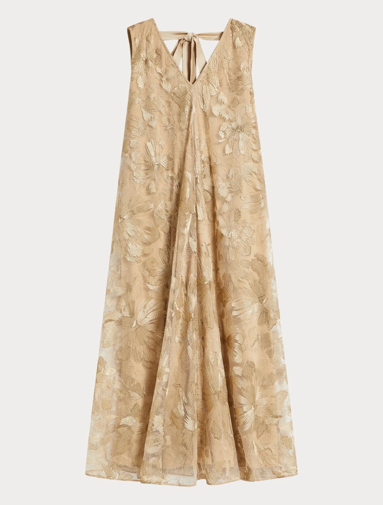 Langes Kleid aus Tüll mit Lamé-Blumenstickerei und tiefem Rückenausschnitt. Die langen Ärmel lassen sich unschwer von einem Schneider anbringen.Das Kleidungsstück ist Teil der Kollektion Elegante.