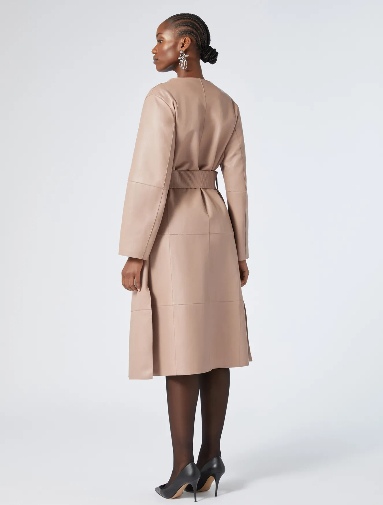 Dieser moderne und komfortable leichter Mantel aus Nappaleder und Jersey zeichnet sich durch ergonomische, kunsthandwerkliche Abnäher aus. Der passende Gürtel aus Nappaleder dient der Weitenregulierung in der Taille.