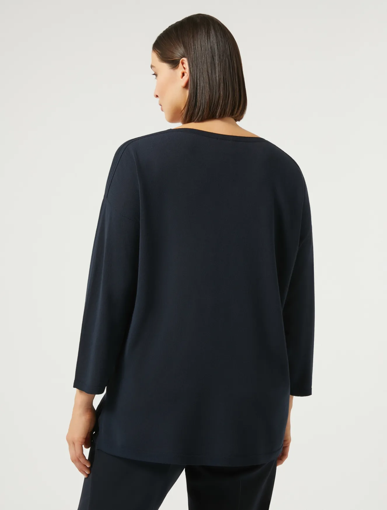 Schlicht gehaltener Pullover aus Crêpe-Viskosestretch mit V-Ausschnitt und Dreiviertelärmeln. Die Glattstrick-Verarbeitung verleiht der Struktur des Kleidungsstücks Charakter.Das Kleidungsstück ist Teil der Kollektion Persona by Marina Rinaldi.