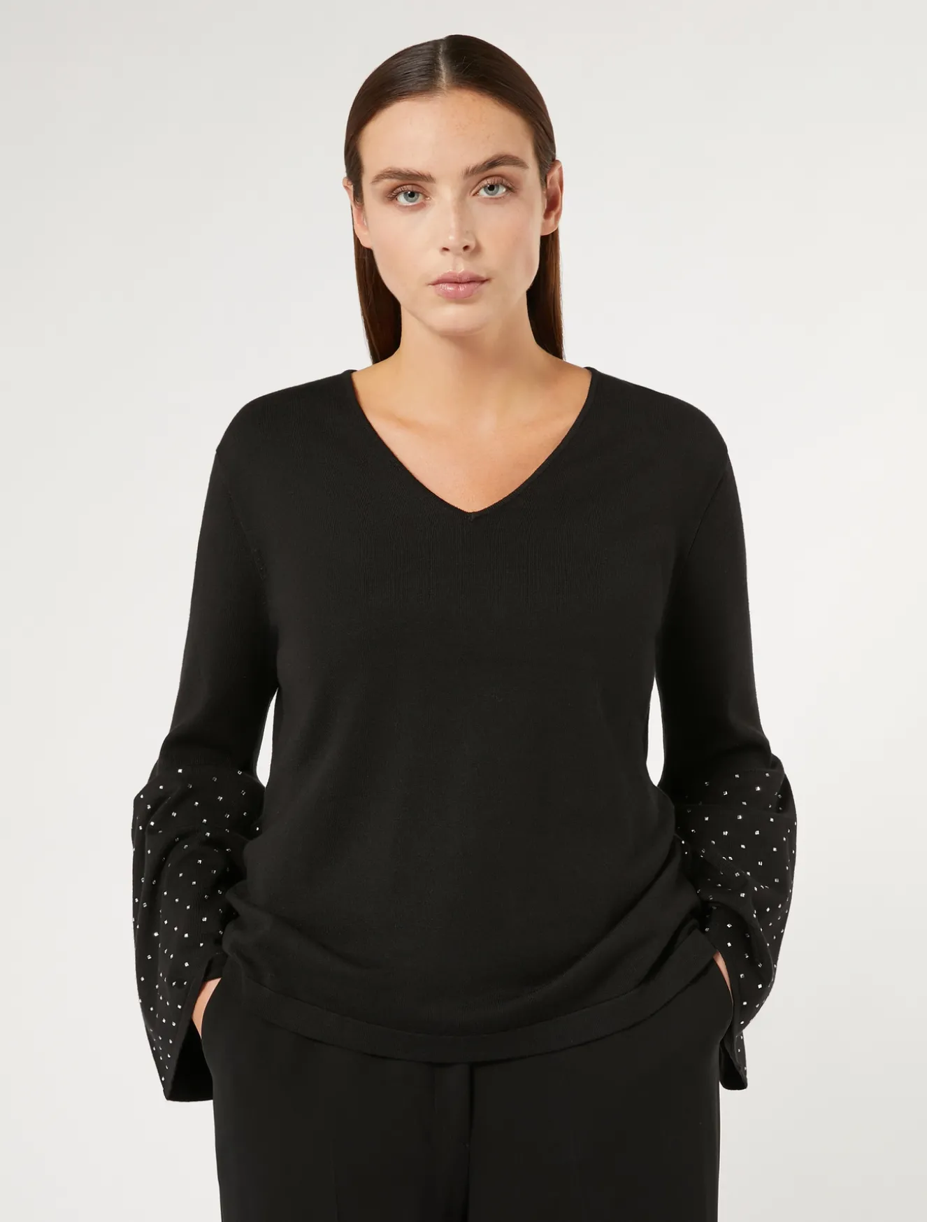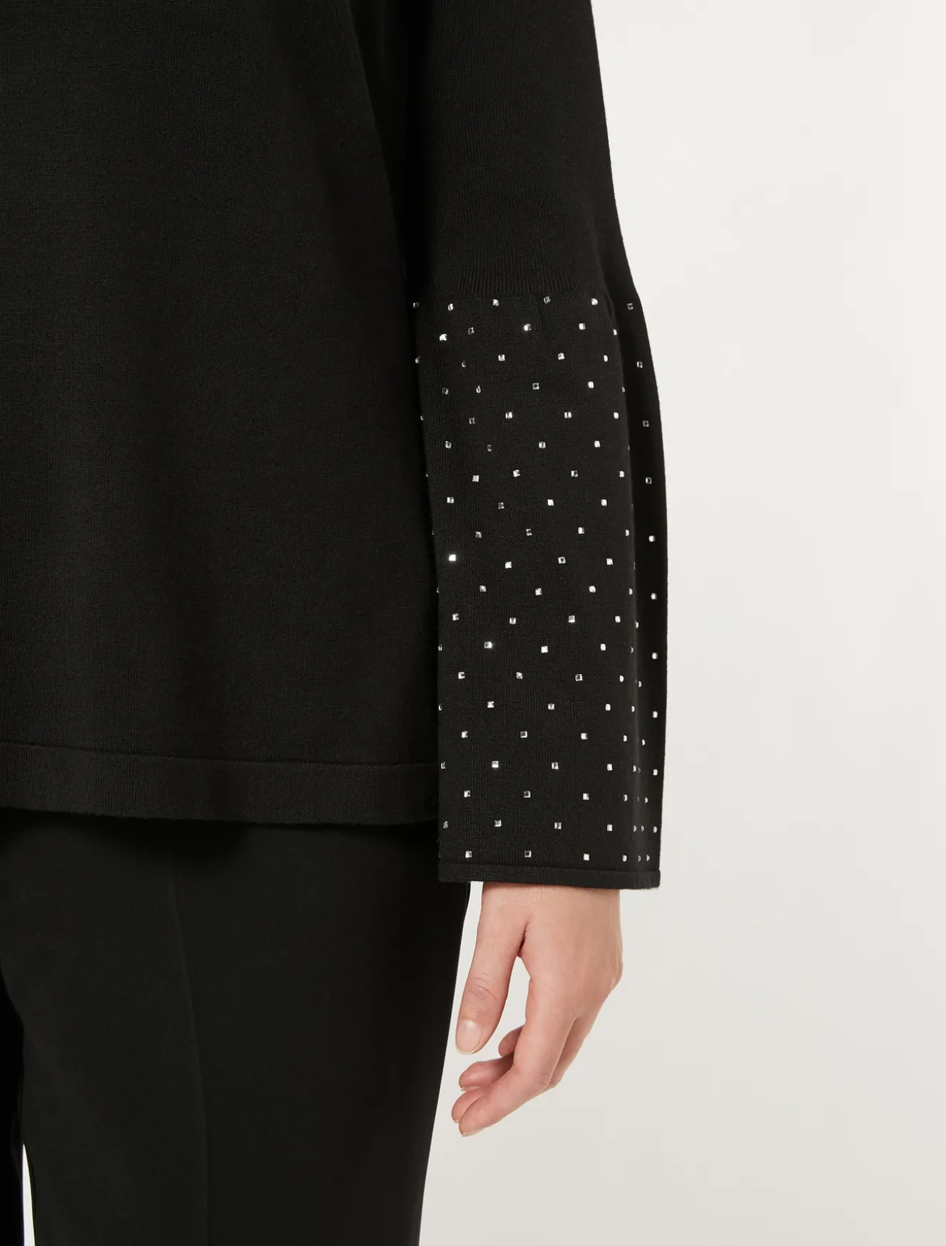 Warmer Pullover aus Viskose-Stretchgarn mit raffinierter Stickerei mit thermoklebende Kristallen an den Bündchen.Das Kleidungsstück ist Teil der Kollektion Elegante.