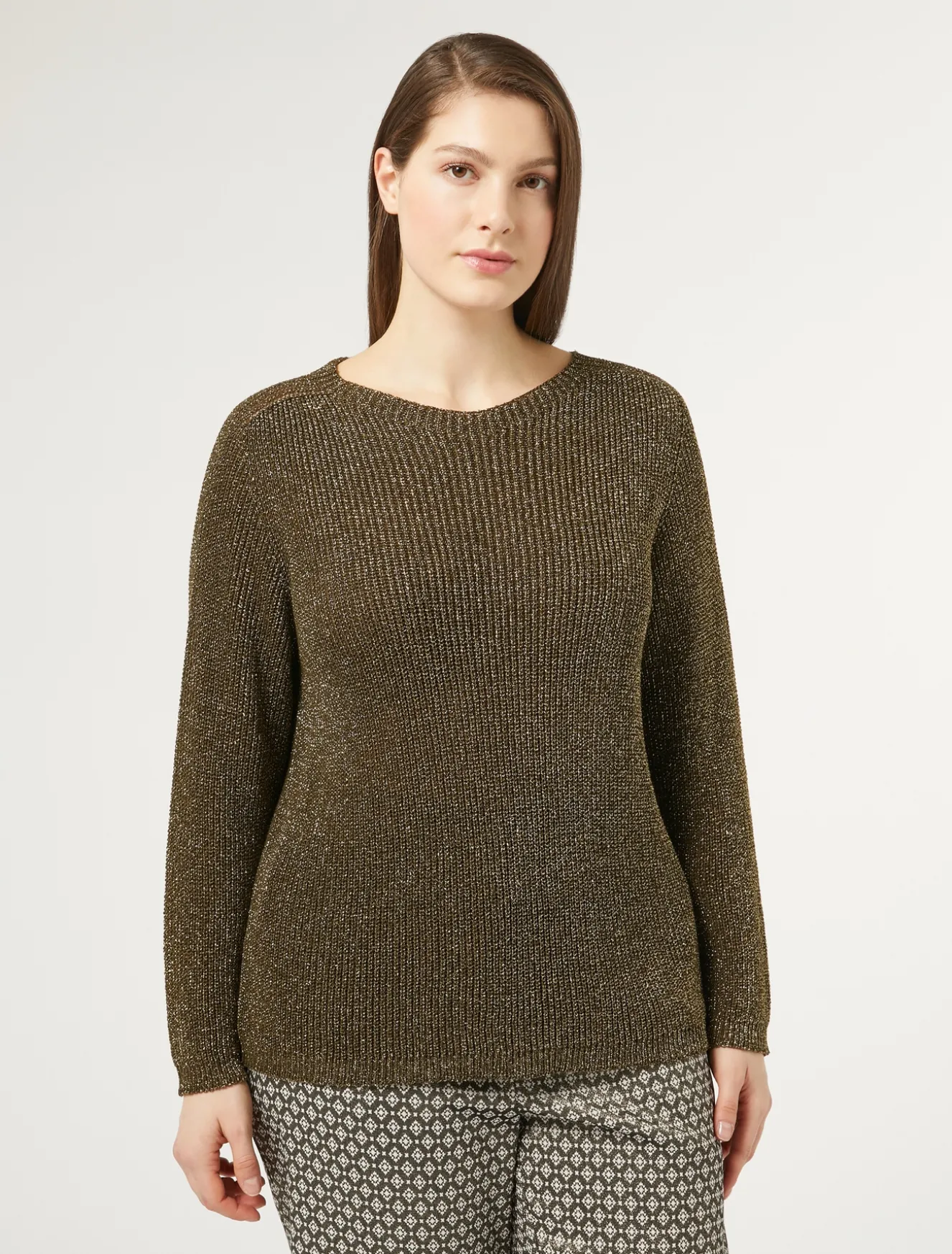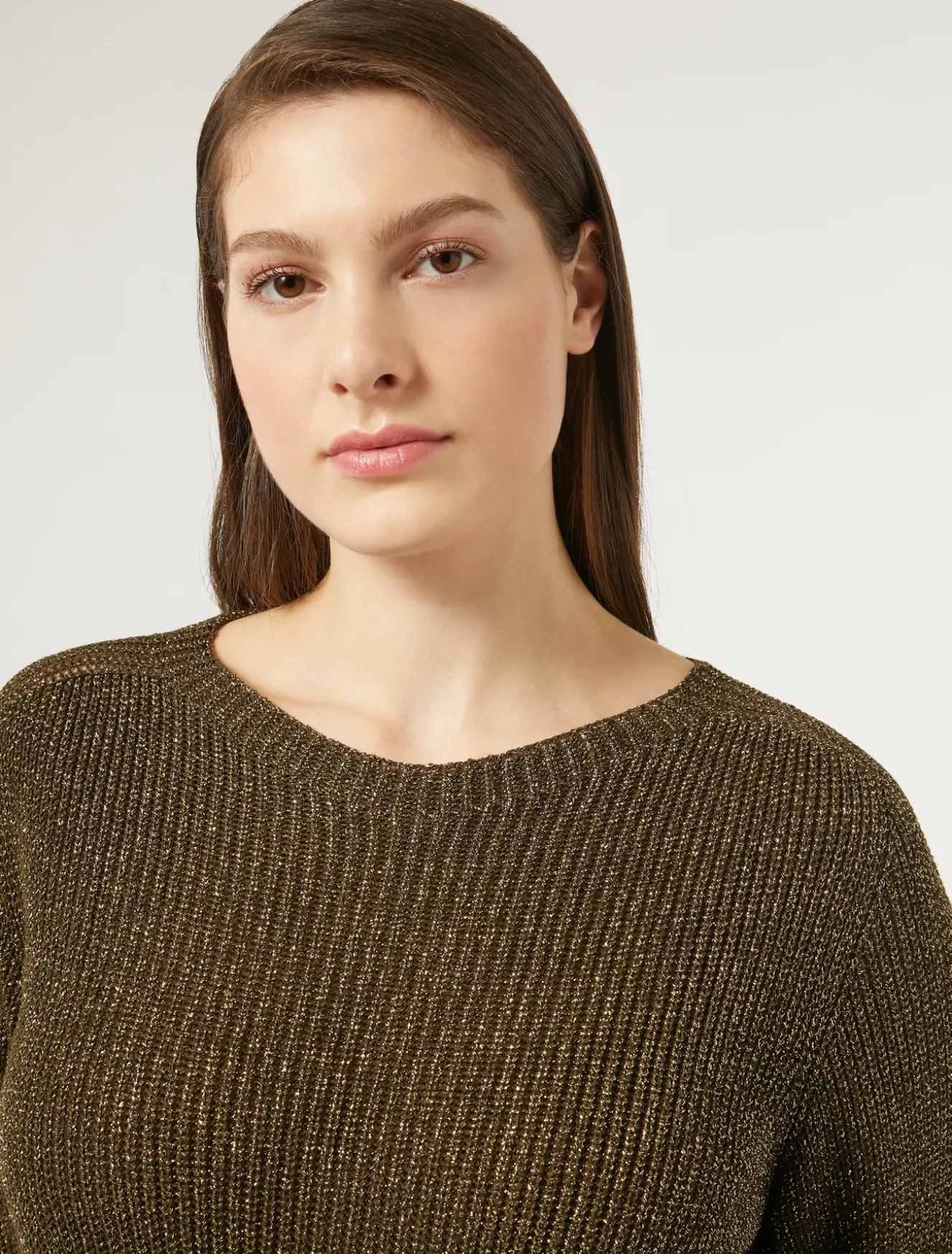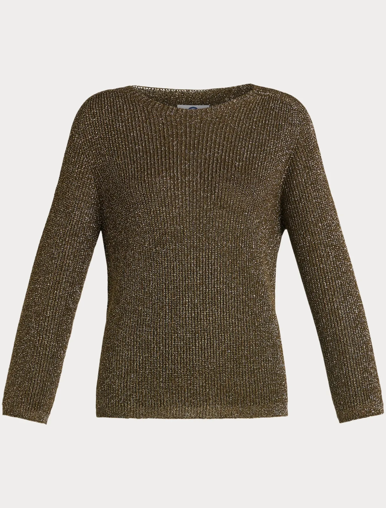 Pullover aus Viskose- und Lurexgarn in Patentmuster-Verarbeitung. Eleganz für jeden Tag.Das Kleidungsstück ist Teil der Kollektion „Voyage“.