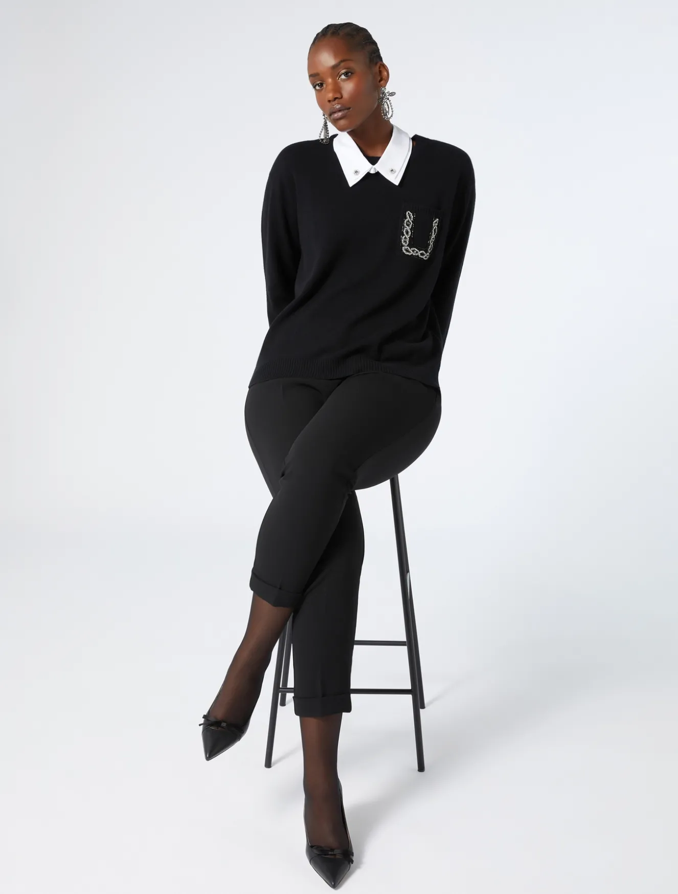 Dieser Cardigan aus einem Kaschmirgemisch hat eine maskuline Silhouette, eine kleine bestickte Tasche mit Schmucksteinen und Steinen. Ein Modell, das sofort zum Star des Looks wird.