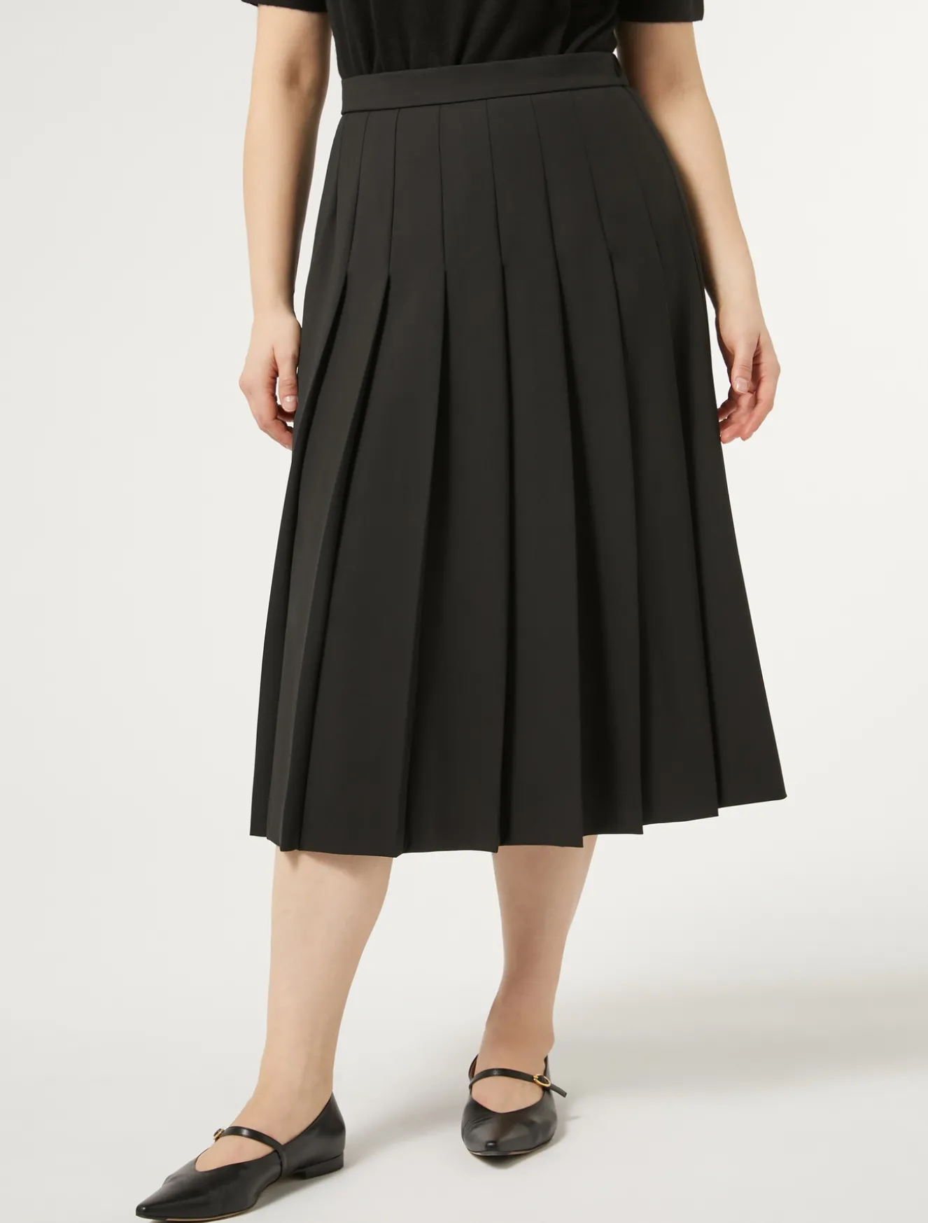 Der Rock ist aus technischem Wollgabardine mit Stretchanteil gefertigt und hat auf der Vorderseite Falten. Raffiniertes Modell, das sich leicht kombinieren lässt.Das Kleidungsstück ist Teil der Kollektion „Voyage“.