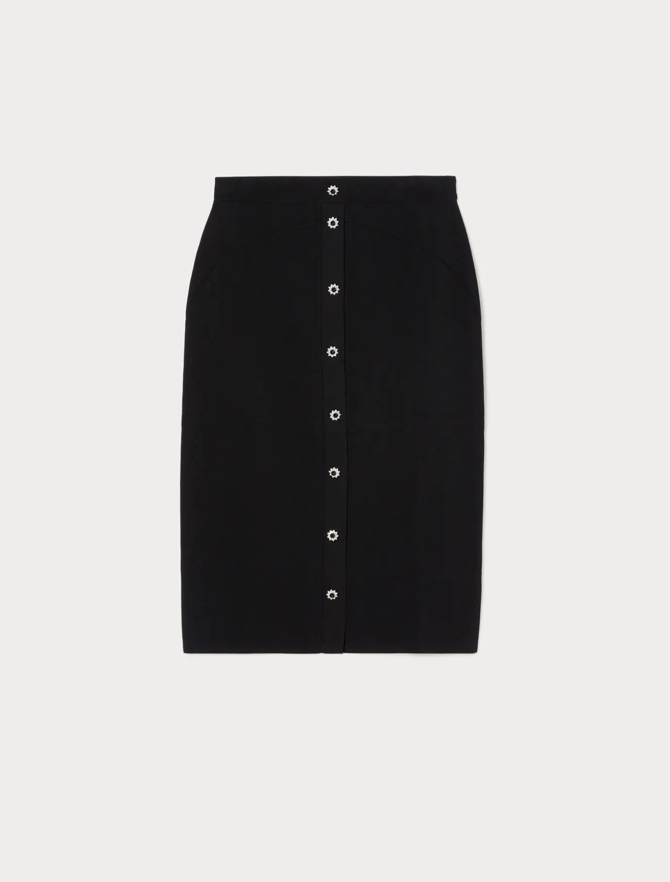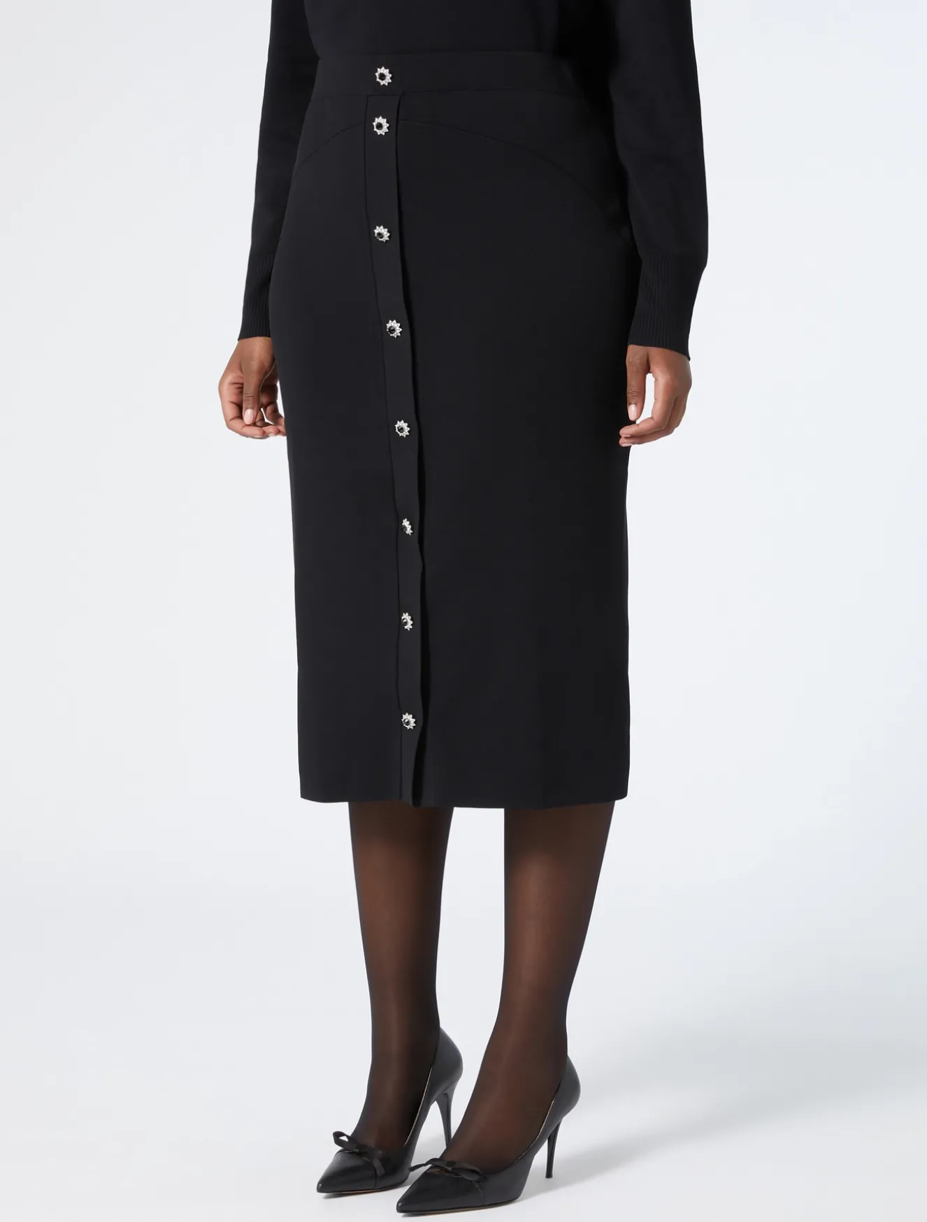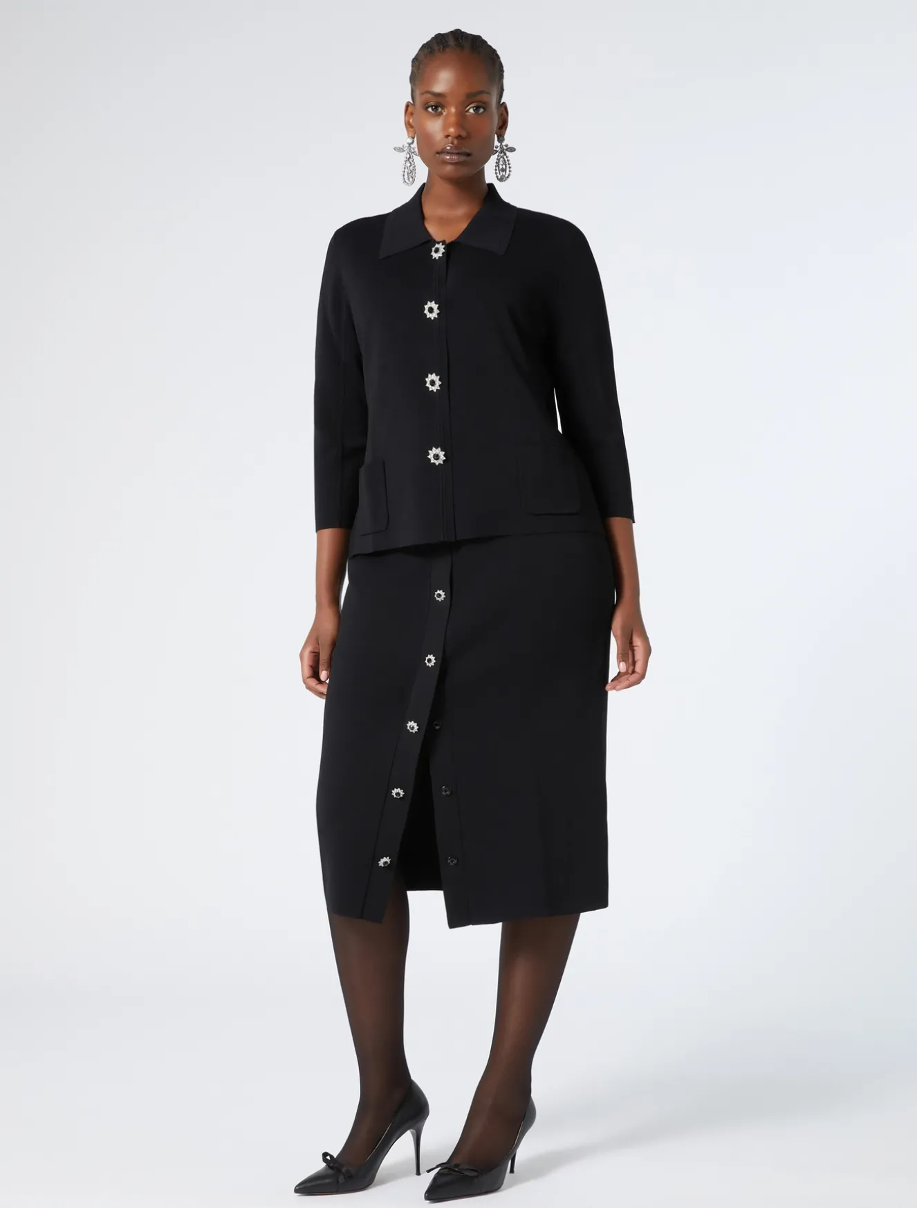 Dieser Bleistiftrock aus einfarbigem Fallmaschenstrick aus matter Comfort-Viskose besticht durch einen schmucksteinbesetzten Knopfverschluss. Tragen Sie ihn einfach, um einen Alltagslock aufzupeppen, auch in Kombination mit dem passenden Pullover.