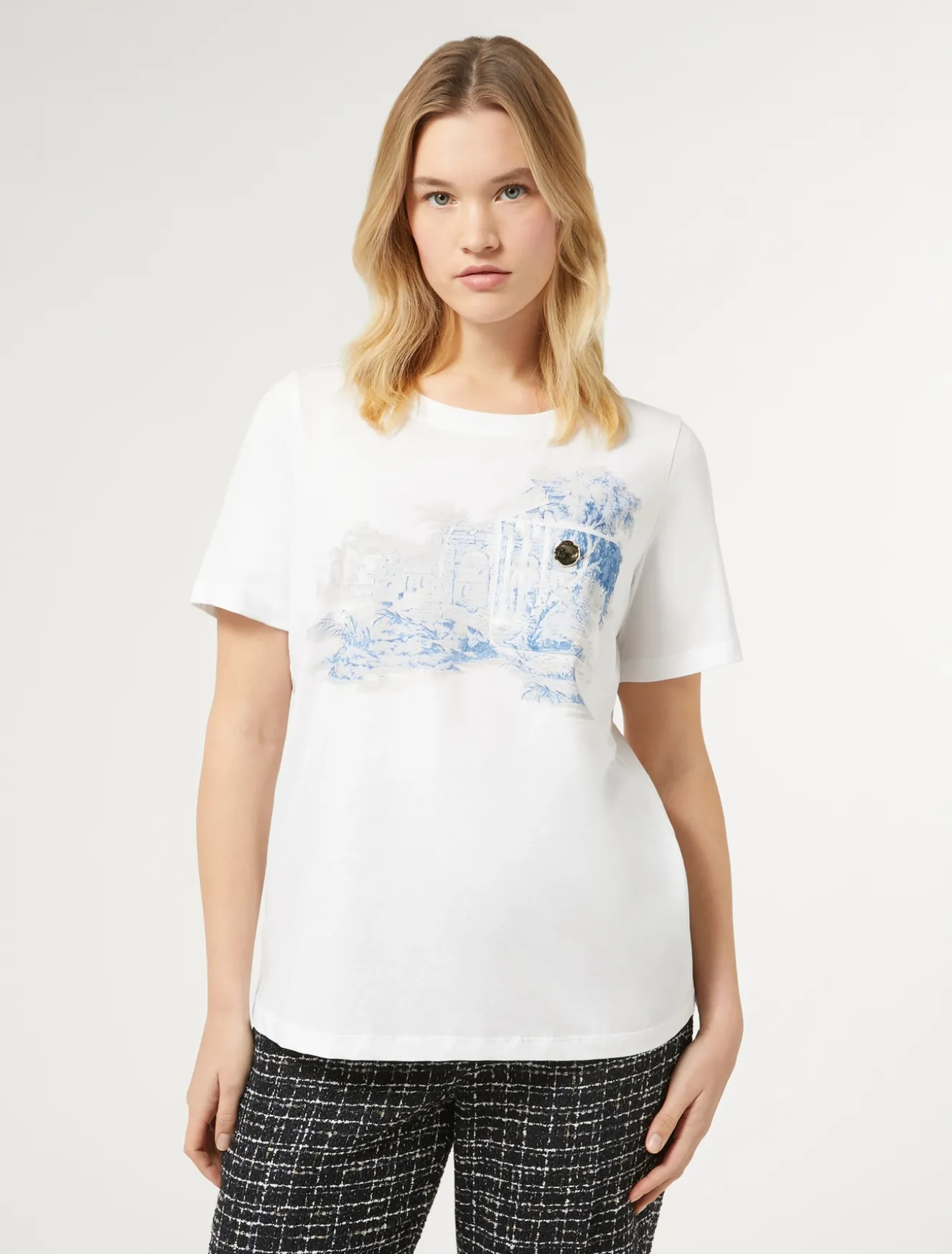 Vervollständige deine Outfits mit diesem T-Shirt aus Baumwoll-Jersey mit Front-Print, Brusttasche und Schmucksteinknopf. Äußerst bequem und einfach zu kombinieren.Dieses Modell gehört zur Hauptkollektion von Marina Rinaldi.