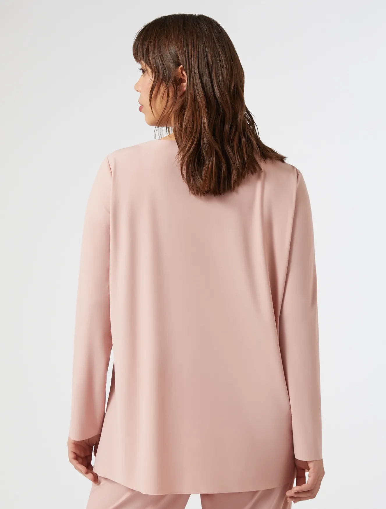 T-Shirt aus Jersey mit unversäubertem Saum, verschweißtem Kragen und Schlitzen vorne, das schlicht und raffiniert gleichzeitig anmutet. Tragen Sie es einfach, um Ihrem Style eine moderne Note zu verleihen.