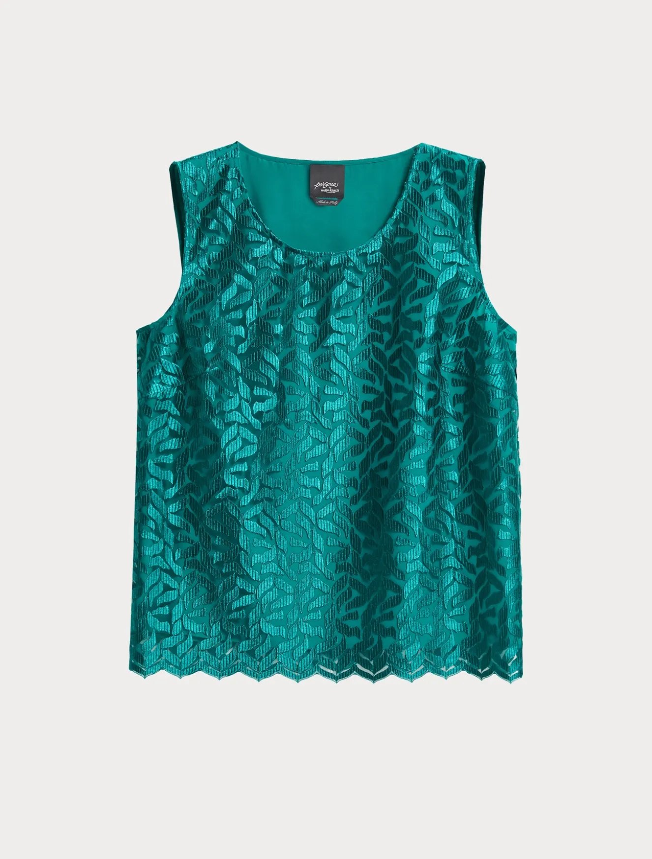 Oberteil aus Tüll mit romantischen Details und stilisierter Blattstickerei. Die Ärmel können unschwer von einem Schneider angebracht werden. Gewellte Säume akzentuieren das Modell mit einem dezenten und raffinierten Touch. Das Kleidungsstück ist Teil der Kollektion Persona by Marina Rinaldi.