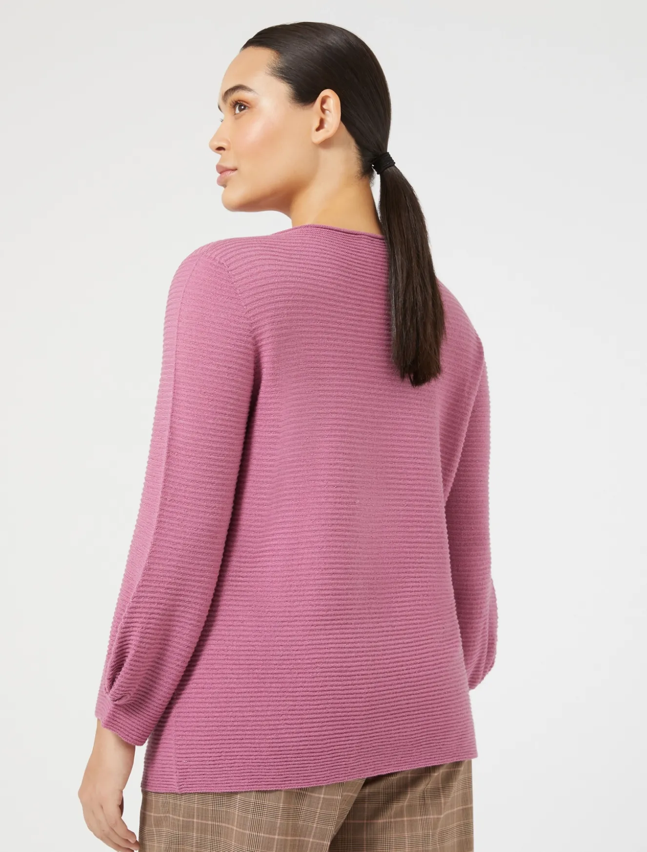 Pullover aus pflegeleichtem Garn aus reiner Wolle in nahtlosem Linksstrick. Jetzt neu mit Rüschenbündchen.Das Kleidungsstück ist Teil der Kollektion „Voyage“.